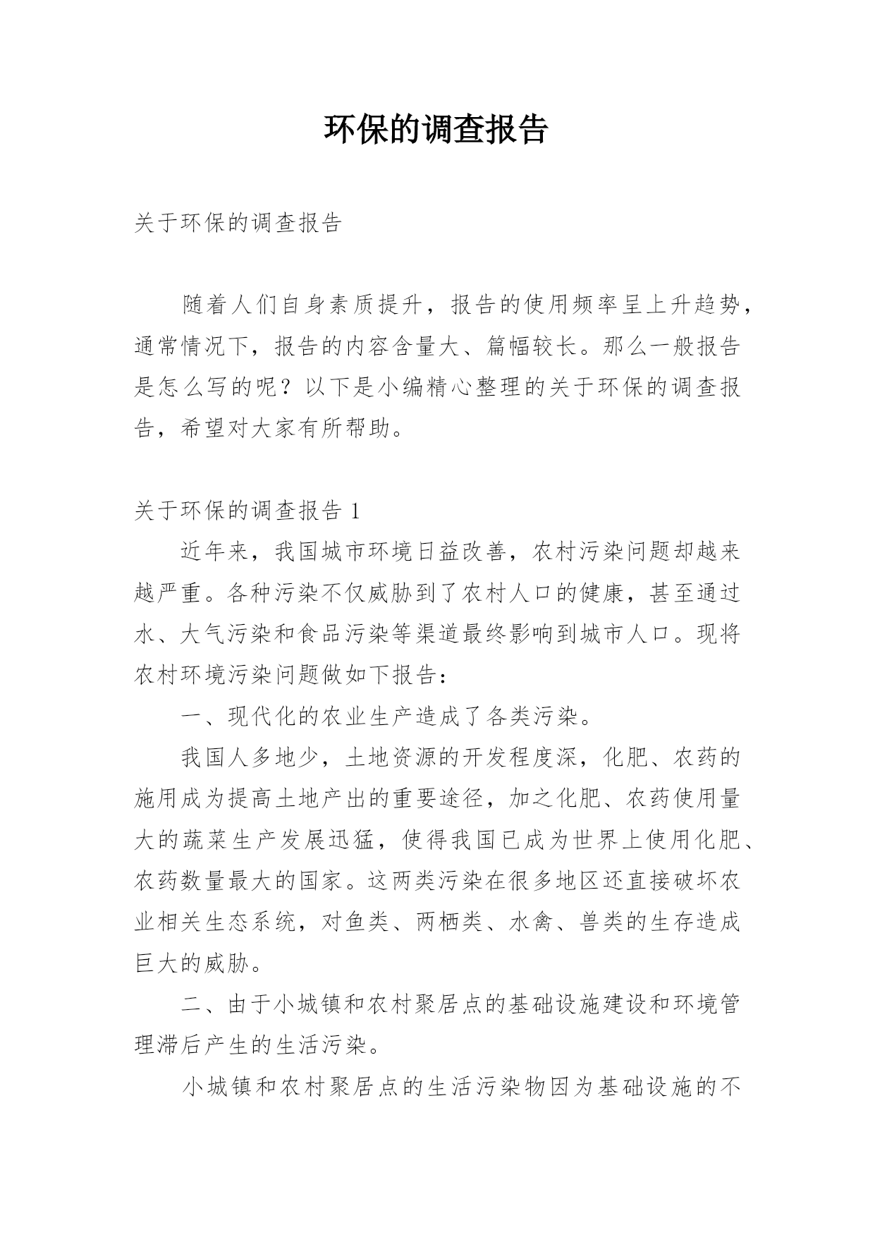 环保的调查报告关于环保的调查报告随着人们自身素质提升,报告的使用频率呈上升趋势,通常情况下,报告的内容含量大、篇幅较长。那么一般报告是怎么写的呢?以下是小编精心整理的关于环保的调查报告,希望对大家有所帮助。关于环保的调查报告1近年来,我国城市环境日益改善,农村污染问题却越来越严重。各种污染不仅威胁到了农村人口的健康,甚至通过水、大气污染和食品污染等渠道最终影响到城市人口。现将农村环境污染问题做如下报告:一、现代化的农业生产造成了各类污染。我国人多地少,土地资源的开发程度深,化肥、农药的施用成为提高土地产出