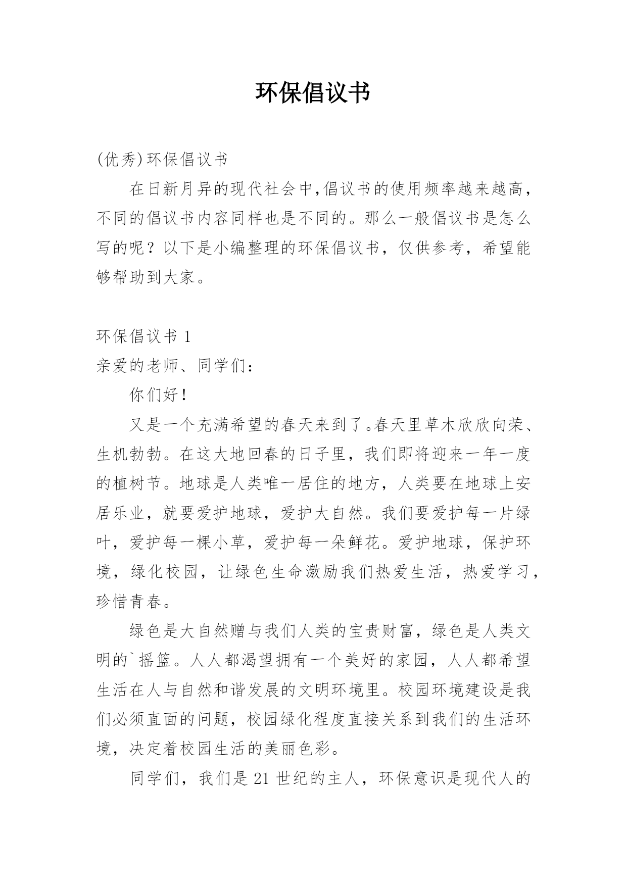 环保倡议书(优秀)环保倡议书在日新月异的现代社会中,倡议书的使用频率越来越高,不同的倡议书内容同样也是不同的。那么一般倡议书是怎么写的呢?以下是小编整理的环保倡议书,仅供参考,希望能够帮助到大家。环保倡议书1亲爱的老师、同学们:你们好!又是一个充满希望的春天来到了。春天里草木欣欣向荣、生机勃勃。在这大地回春的日子里,我们即将迎来一年一度的植树节。地球是人类唯一居住的地方,人类要在地球上安居乐业,就要爱护地球,爱护大自然。我们要爱护每一片绿叶,爱护每一棵小草,爱护每一朵鲜花。爱护地球,保护环境,绿化校园,让