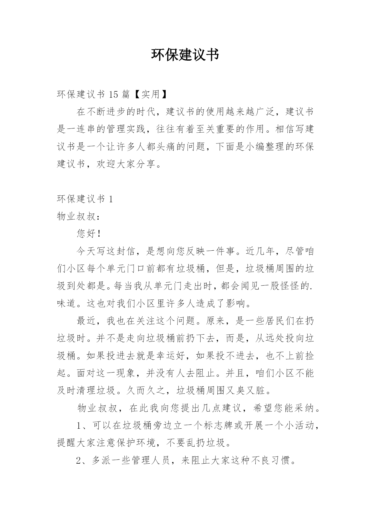 环保建议书环保建议书15篇【实用】在不断进步的时代,建议书的使用越来越广泛,建议书是一连串的管理实践,往往有着至关重要的作用。相信写建议书是一个让许多人都头痛的问题,下面是小编整理的环保建议书,欢迎大家分享。环保建议书1物业叔叔:您好!今天写这封信,是想向您反映一件事。近几年,尽管咱们小区每个单元门口前都有垃圾桶,但是,垃圾桶周围的垃圾到处都是。每当我从单元门走出时,都会闻见一股怪怪的.味道。这也对我们小区里许多人造成了影响。最近,我也在关注这个问题。原来,是一些居民们在扔垃圾时。并不是走向垃圾桶前扔下去