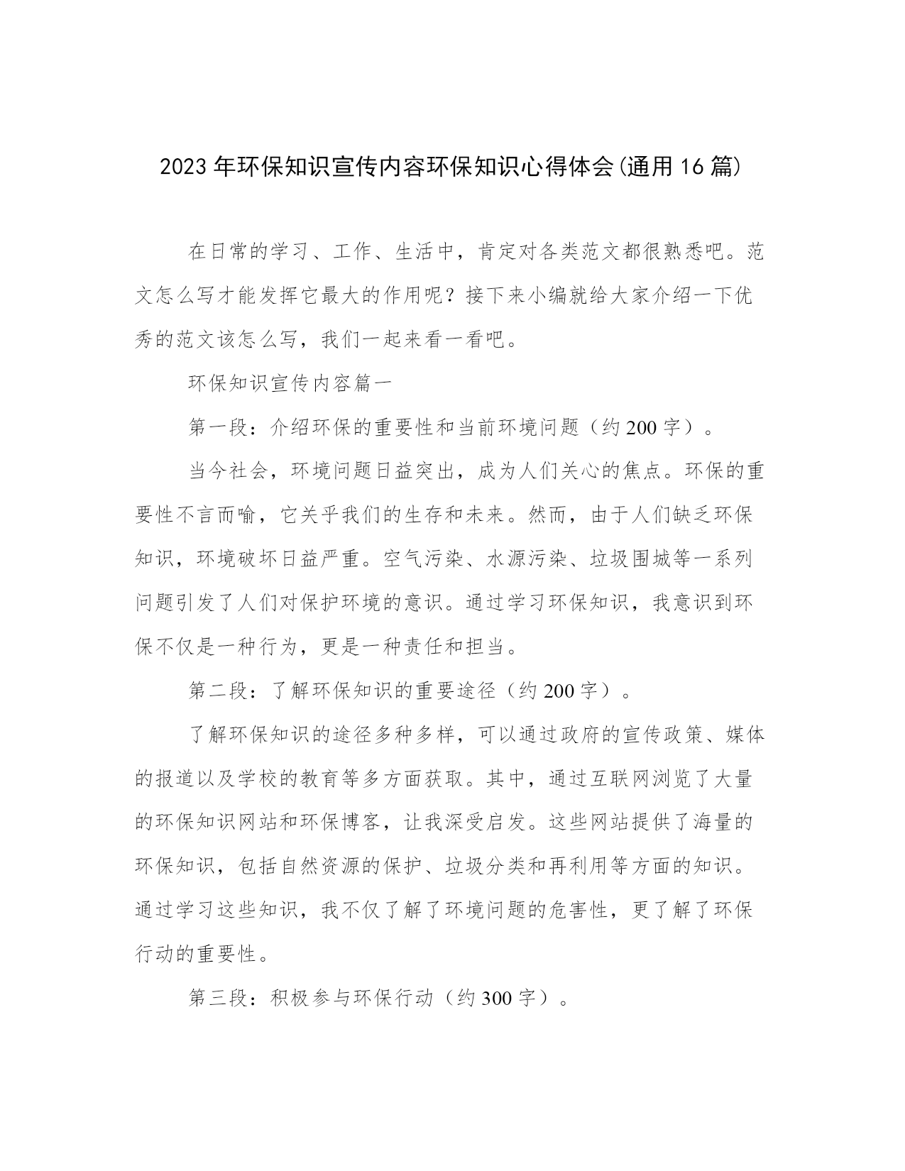 2023年环保知识宣传内容环保知识心得体会(通用16篇).docx