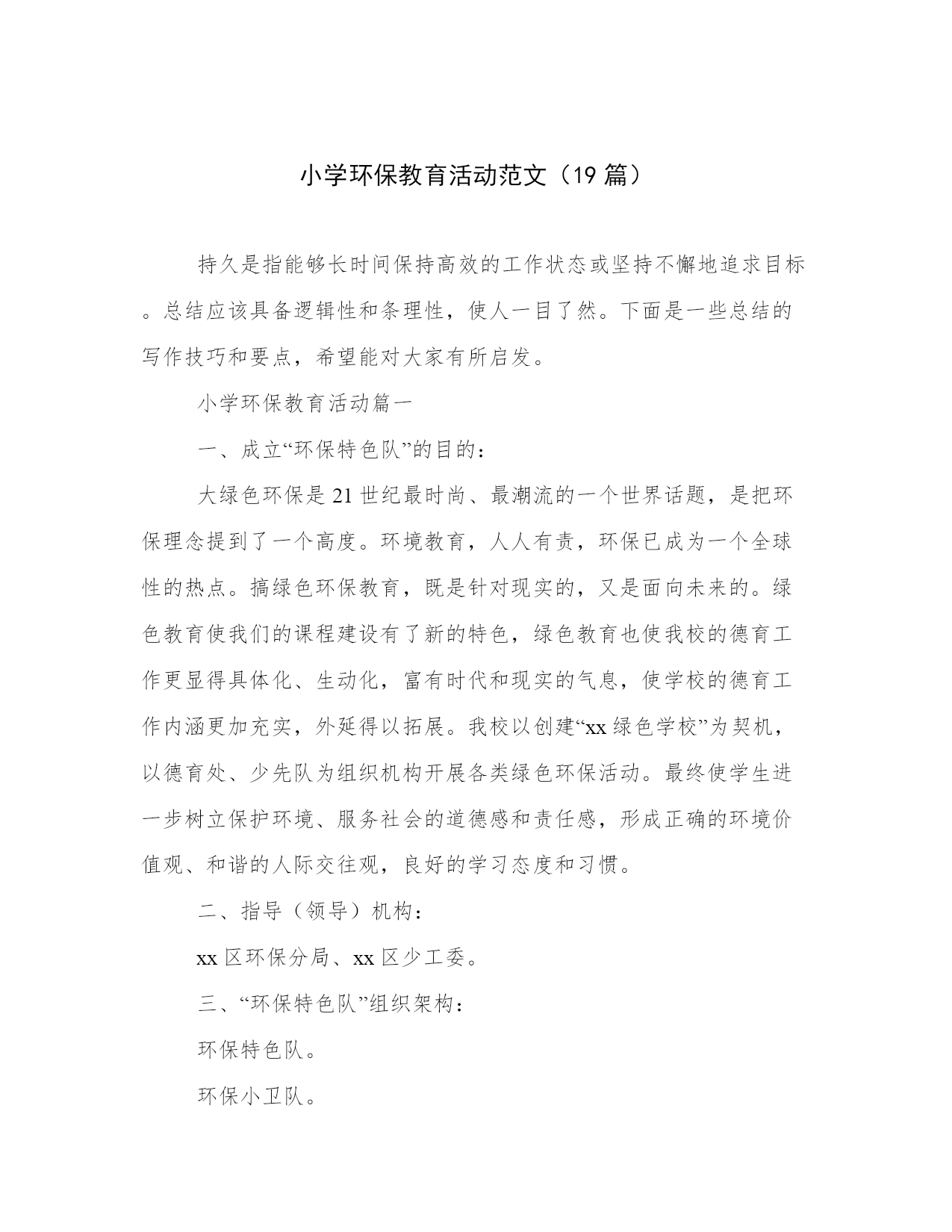 小学环保教育活动范文(19篇)持久是指能够长时间保持高效的工作状态或坚持不懈地追求目标。总结应该具备逻辑性和条理性,使人一目了然。下面是一些总结的写作技巧和要点,希望能对大家有所启发。小学环保教育活动篇一一、成立“环保特色队”的目的:大绿色环保是21世纪最时尚、最潮流的一个世界话题,是把环保理念提到了一个高度。环境教育,人人有责,环保已成为一个全球性的热点。搞绿色环保教育,既是针对现实的,又是面向未来的。绿色教育使我们的课程建设有了新的特色,绿色教育也使我校的德育工作更显得具体化、生动化,富有时代和现实的