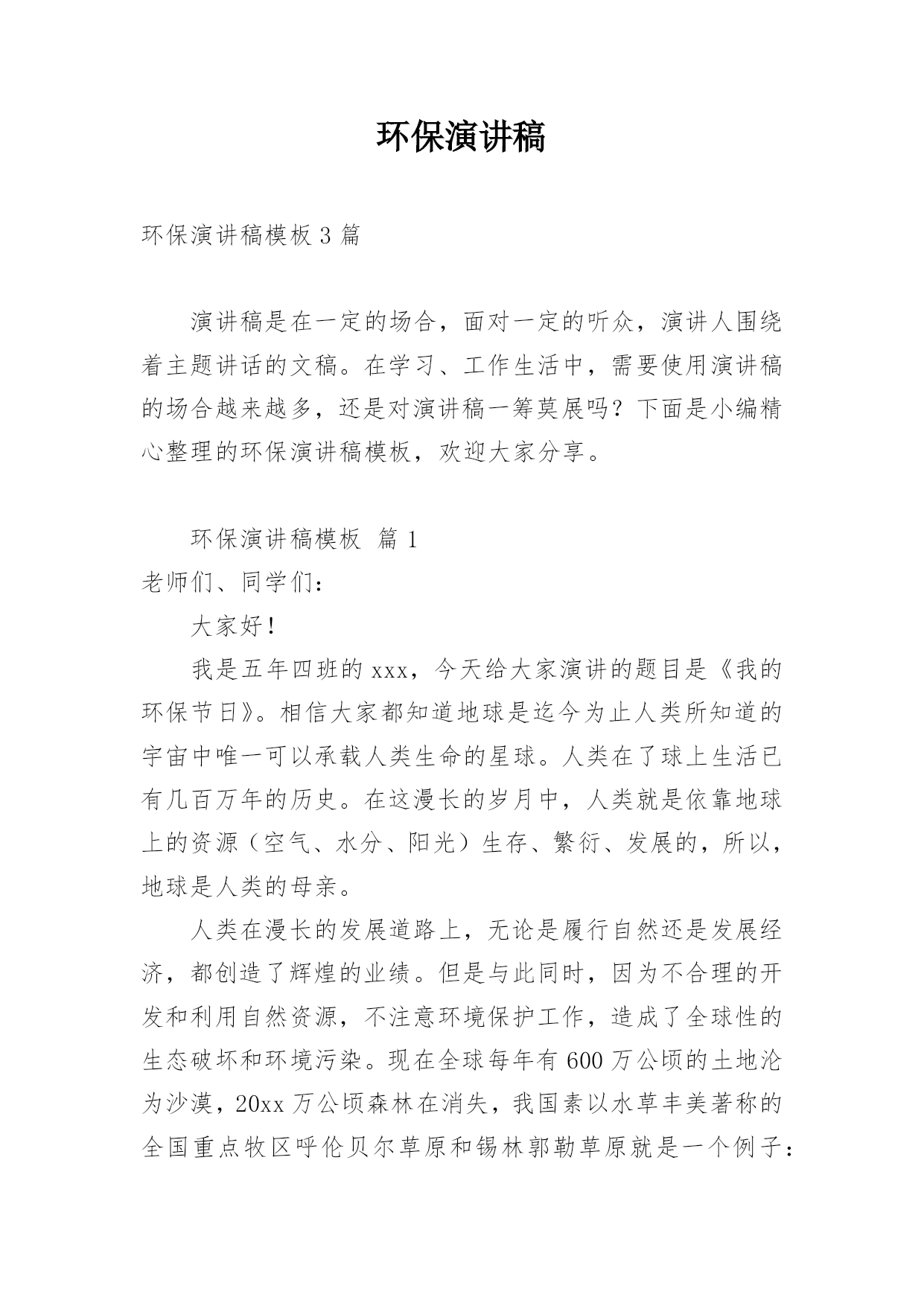 环保演讲稿环保演讲稿模板3篇演讲稿是在一定的场合,面对一定的听众,演讲人围绕着主题讲话的文稿。在学习、工作生活中,需要使用演讲稿的场合越来越多,还是对演讲稿一筹莫展吗?下面是小编精心整理的环保演讲稿模板,欢迎大家分享。环保演讲稿模板篇1老师们、同学们:大家好!我是五年四班的xxx,今天给大家演讲的题目是《我的环保节日》。相信大家都知道地球是迄今为止人类所知道的宇宙中唯一可以承载人类生命的星球。人类在了球上生活已有几百万年的历史。在这漫长的岁月中,人类就是依靠地球上的资源(空气、水分、阳光)生存、繁衍、发展