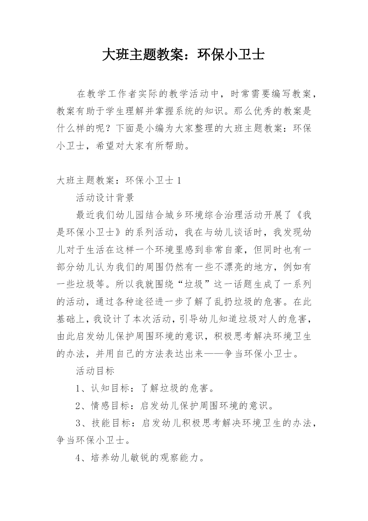 大班主题教案:环保小卫士在教学工作者实际的教学活动中,时常需要编写教案,教案有助于学生理解并掌握系统的知识。那么优秀的教案是什么样的呢?下面是小编为大家整理的大班主题教案:环保小卫士,希望对大家有所帮助。大班主题教案:环保小卫士1活动设计背景最近我们幼儿园结合城乡环境综合治理活动开展了《我是环保小卫士》的系列活动,我在与幼儿谈话时,我发现幼儿对于生活在这样一个环境里感到非常自豪,但同时也有一部分幼儿认为我们的周围仍然有一些不漂亮的地方,例如有一些垃圾等。所以我就围绕“垃圾”这一话题生成了一系列的活动,通过
