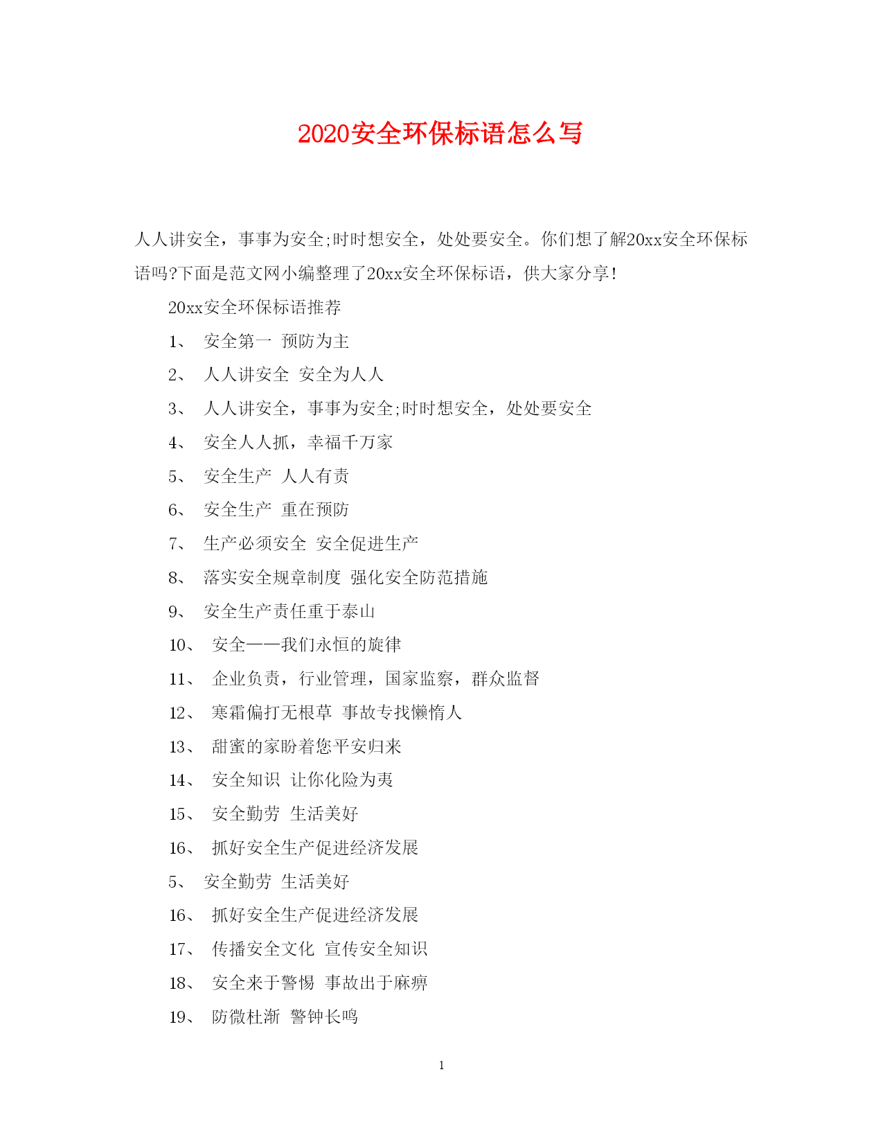 此资料由网络收集而来,如有侵权请告知上传者立即删除。资料共分享,我们负责传递知识。PAGEPAGE32020安全环保标语怎么写人人讲安全,事事为安全;时时想安全,处处要安全。你们想了解20xx安全环保标语吗?下面是范文网小编整理了20xx安全环保标语,供大家分享!20xx安全环保标语推荐1、安全第一预防为主2、人人讲安全安全为人人3、人人讲安全,事事为安全;时时想安全,处处要安全4、安全人人抓,幸福千万家5、安全生产人人有责6、安全生产重在预防7、生产必须安全安全促进生产8、落实安全规章制度强