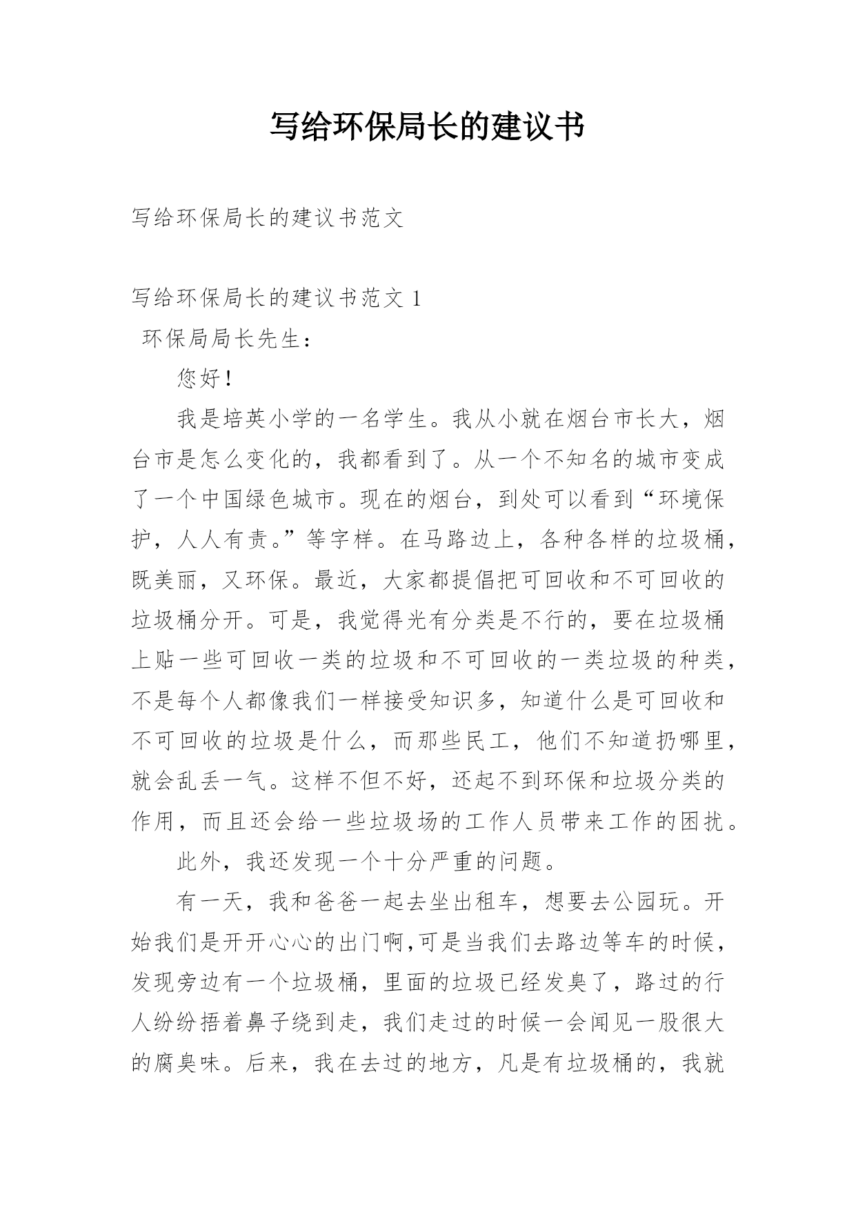 写给环保局长的建议书写给环保局长的建议书范文写给环保局长的建议书范文1环保局局长先生:您好!我是培英小学的一名学生。我从小就在烟台市长大,烟台市是怎么变化的,我都看到了。从一个不知名的城市变成了一个中国绿色城市。现在的烟台,到处可以看到“环境保护,人人有责。”等字样。在马路边上,各种各样的垃圾桶,既美丽,又环保。最近,大家都提倡把可回收和不可回收的垃圾桶分开。可是,我觉得光有分类是不行的,要在垃圾桶上贴一些可回收一类的垃圾和不可回收的一类垃圾的种类,不是每个人都像我们一样接受知识多,知道什么是可回收和不可