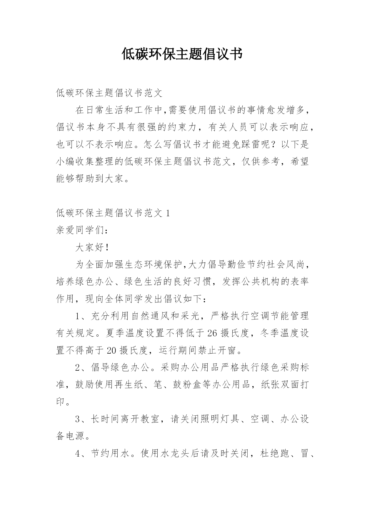 低碳环保主题倡议书低碳环保主题倡议书范文在日常生活和工作中,需要使用倡议书的事情愈发增多,倡议书本身不具有很强的约束力,有关人员可以表示响应,也可以不表示响应。怎么写倡议书才能避免踩雷呢?以下是小编收集整理的低碳环保主题倡议书范文,仅供参考,希望能够帮助到大家。低碳环保主题倡议书范文1亲爱同学们:大家好!为全面加强生态环境保护,大力倡导勤俭节约社会风尚,培养绿色办公、绿色生活的良好习惯,发挥公共机构的表率作用,现向全体同学发出倡议如下:1、充分利用自然通风和采光,严格执行空调节能管理有关规定。夏季温度设置