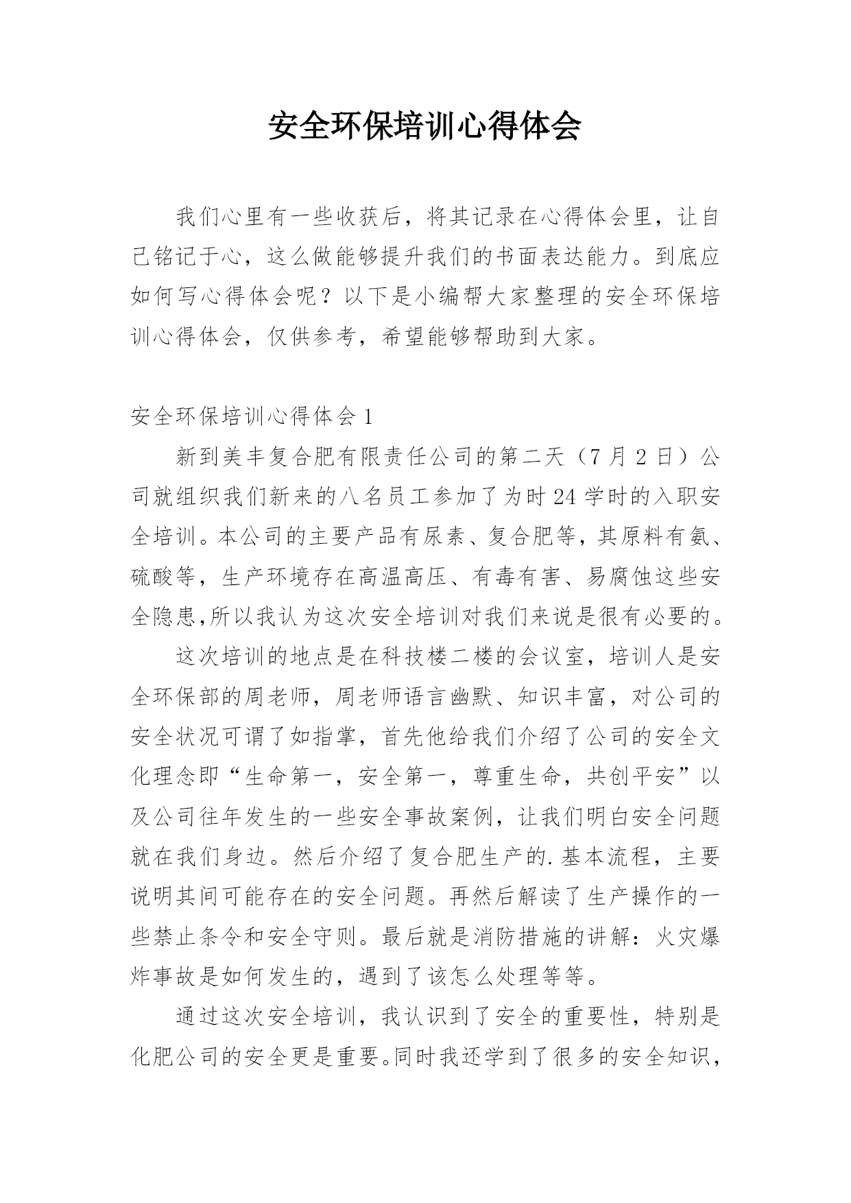 安全环保培训心得体会我们心里有一些收获后,将其记录在心得体会里,让自己铭记于心,这么做能够提升我们的书面表达能力。到底应如何写心得体会呢?以下是小编帮大家整理的安全环保培训心得体会,仅供参考,希望能够帮助到大家。安全环保培训心得体会1新到美丰复合肥有限责任公司的第二天(7月2日)公司就组织我们新来的八名员工参加了为时24学时的入职安全培训。本公司的主要产品有尿素、复合肥等,其原料有氨、硫酸等,生产环境存在高温高压、有毒有害、易腐蚀这些安全隐患,所以我认为这次安全培训对我们来说是很有必要的。这次培训的地点是