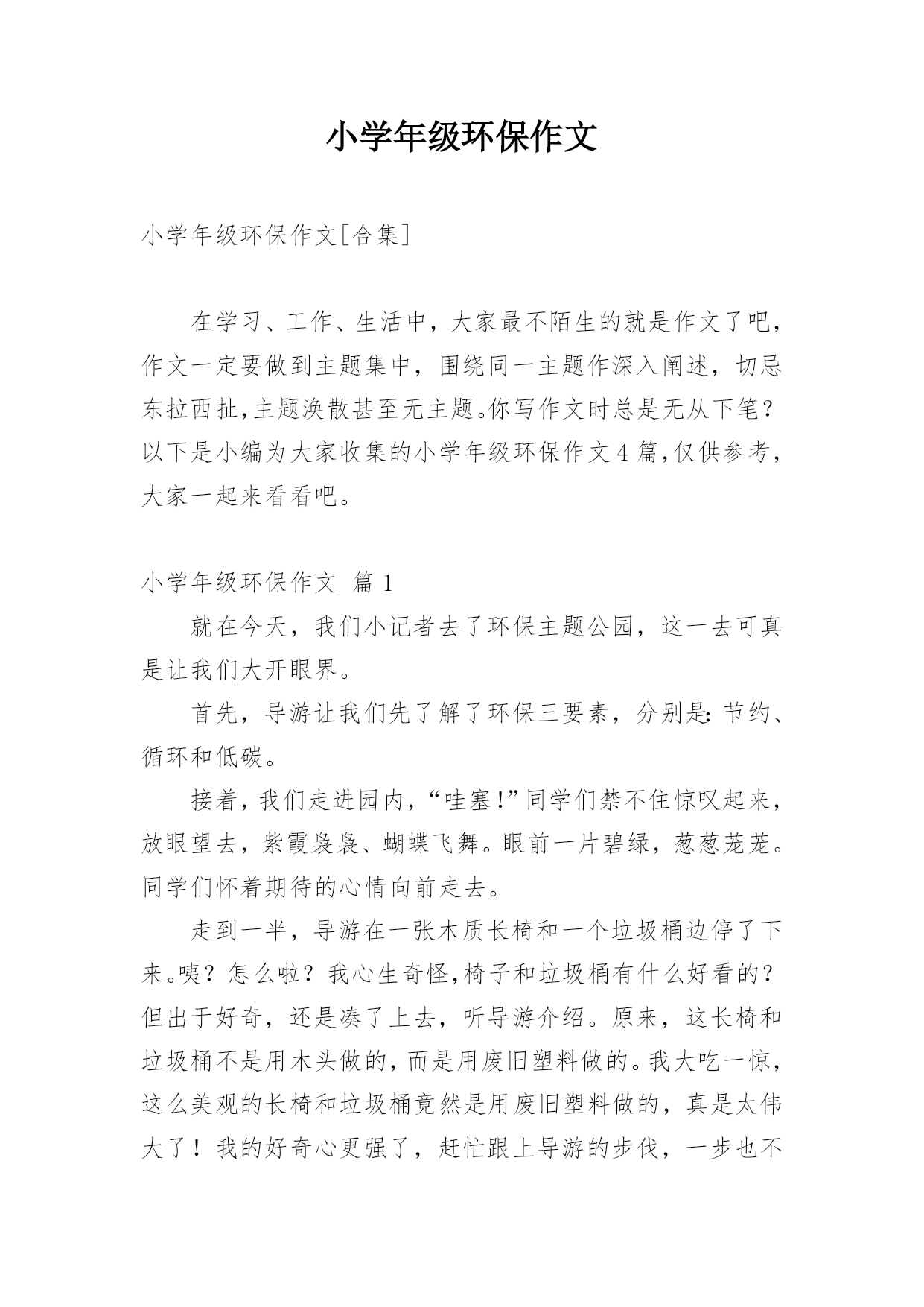小学年级环保作文小学年级环保作文[合集]在学习、工作、生活中,大家最不陌生的就是作文了吧,作文一定要做到主题集中,围绕同一主题作深入阐述,切忌东拉西扯,主题涣散甚至无主题。你写作文时总是无从下笔?以下是小编为大家收集的小学年级环保作文4篇,仅供参考,大家一起来看看吧。小学年级环保作文篇1就在今天,我们小记者去了环保主题公园,这一去可真是让我们大开眼界。首先,导游让我们先了解了环保三要素,分别是:节约、循环和低碳。接着,我们走进园内,“哇塞!”同学们禁不住惊叹起来,放眼望去,紫霞袅袅、蝴蝶飞舞。眼前一片碧绿