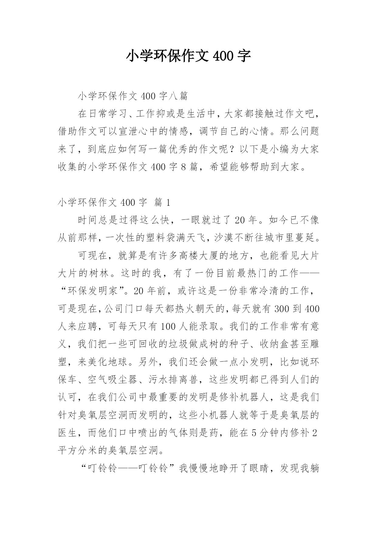 小学环保作文400字小学环保作文400字八篇在日常学习、工作抑或是生活中,大家都接触过作文吧,借助作文可以宣泄心中的情感,调节自己的心情。那么问题来了,到底应如何写一篇优秀的作文呢?以下是小编为大家收集的小学环保作文400字8篇,希望能够帮助到大家。小学环保作文400字篇1时间总是过得这么快,一眼就过了20年。如今已不像从前那样,一次性的塑料袋满天飞,沙漠不断往城市里蔓延。可现在,就算是有许多高楼大厦的地方,也能看见大片大片的树林。这时的我,有了一份目前最热门的工作——“环保发明家”。20年前,或许这是一