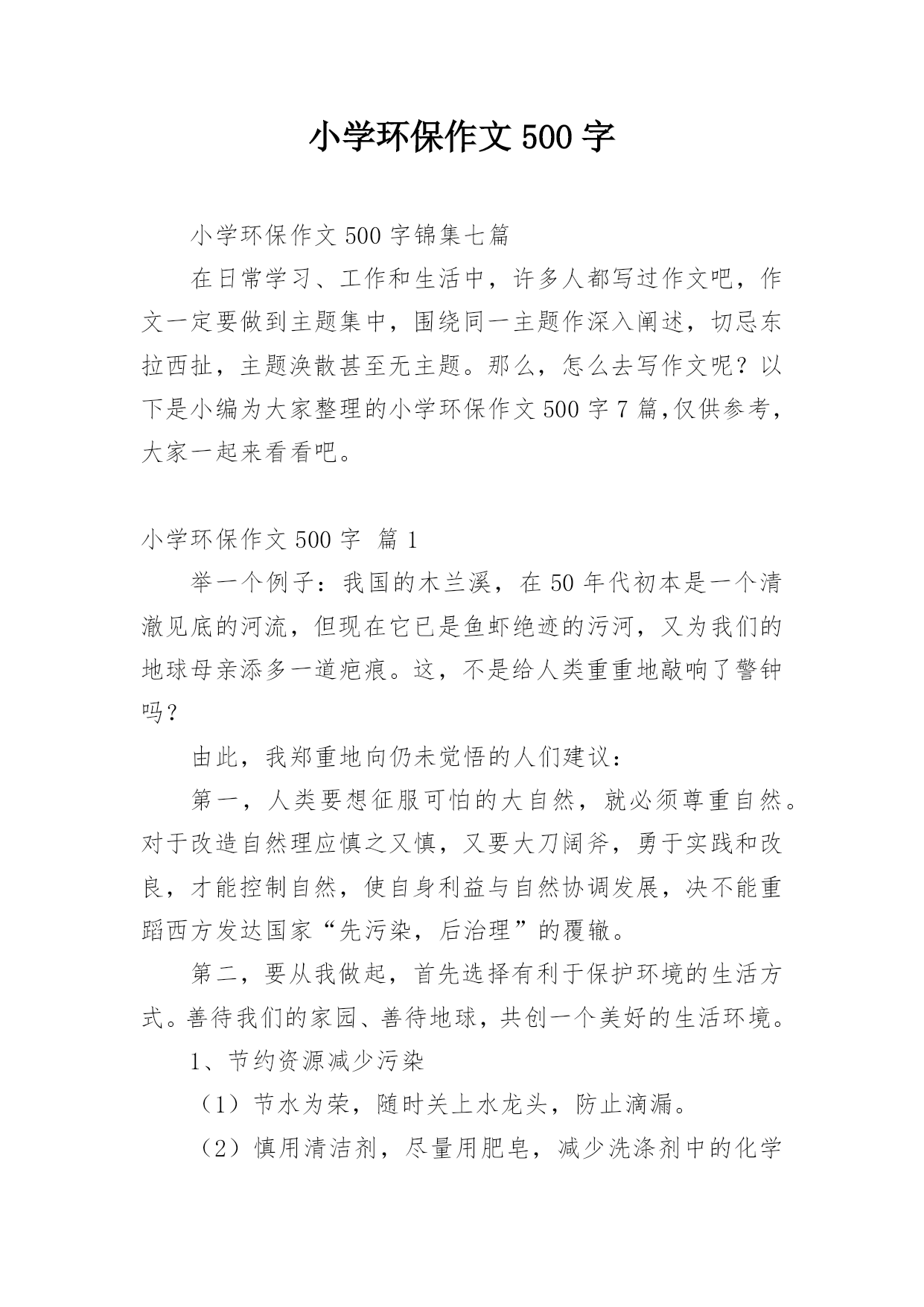 小学环保作文500字小学环保作文500字锦集七篇在日常学习、工作和生活中,许多人都写过作文吧,作文一定要做到主题集中,围绕同一主题作深入阐述,切忌东拉西扯,主题涣散甚至无主题。那么,怎么去写作文呢?以下是小编为大家整理的小学环保作文500字7篇,仅供参考,大家一起来看看吧。小学环保作文500字篇1举一个例子:我国的木兰溪,在50年代初本是一个清澈见底的河流,但现在它已是鱼虾绝迹的污河,又为我们的地球母亲添多一道疤痕。这,不是给人类重重地敲响了警钟吗?由此,我郑重地向仍未觉悟的人们建议:第一,人类要想征服可