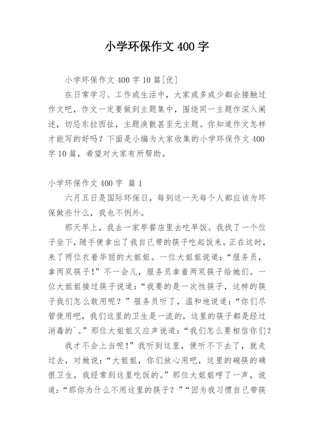小学环保作文400字小学环保作文400字10篇[优]在日常学习、工作或生活中,大家或多或少都会接触过作文吧,作文一定要做到主题集中,围绕同一主题作深入阐述,切忌东拉西扯,主题涣散甚至无主题。你知道作文怎样才能写的好吗?下面是小编为大家收集的小学环保作文400字10篇,希望对大家有所帮助。小学环保作文400字篇1六月五日是国际环保日,每到这一天每个人都应该为环保做些什么,我也不例外。那天早上,我去一家早餐店里去吃早饭。我找了一个位子坐下,随手便拿出了我自己带的筷子吃起饭来。正在这时,来了两位衣着华丽的大姐姐