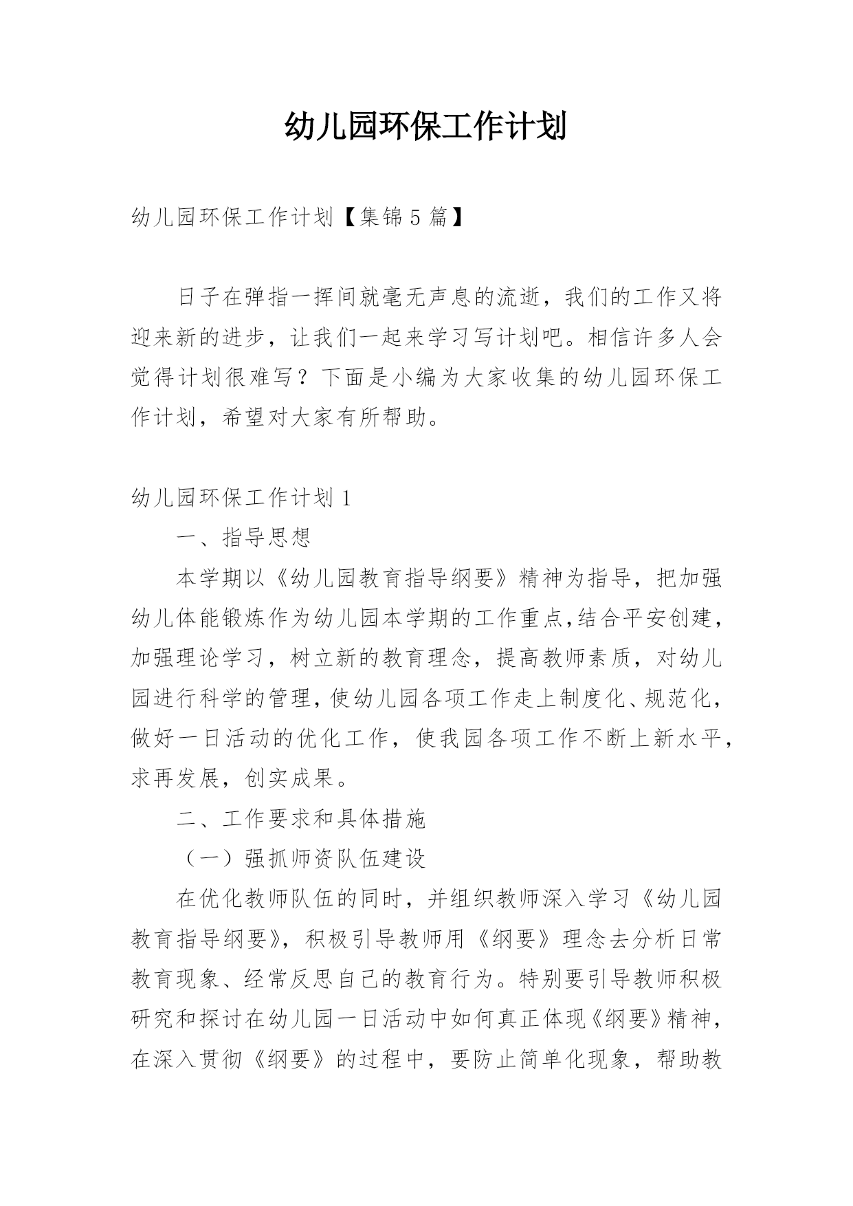 幼儿园环保工作计划幼儿园环保工作计划【集锦5篇】日子在弹指一挥间就毫无声息的流逝,我们的工作又将迎来新的进步,让我们一起来学习写计划吧。相信许多人会觉得计划很难写?下面是小编为大家收集的幼儿园环保工作计划,希望对大家有所帮助。幼儿园环保工作计划1一、指导思想本学期以《幼儿园教育指导纲要》精神为指导,把加强幼儿体能锻炼作为幼儿园本学期的工作重点,结合平安创建,加强理论学习,树立新的教育理念,提高教师素质,对幼儿园进行科学的管理,使幼儿园各项工作走上制度化、规范化,做好一日活动的优化工作,使我园各项工作不断上