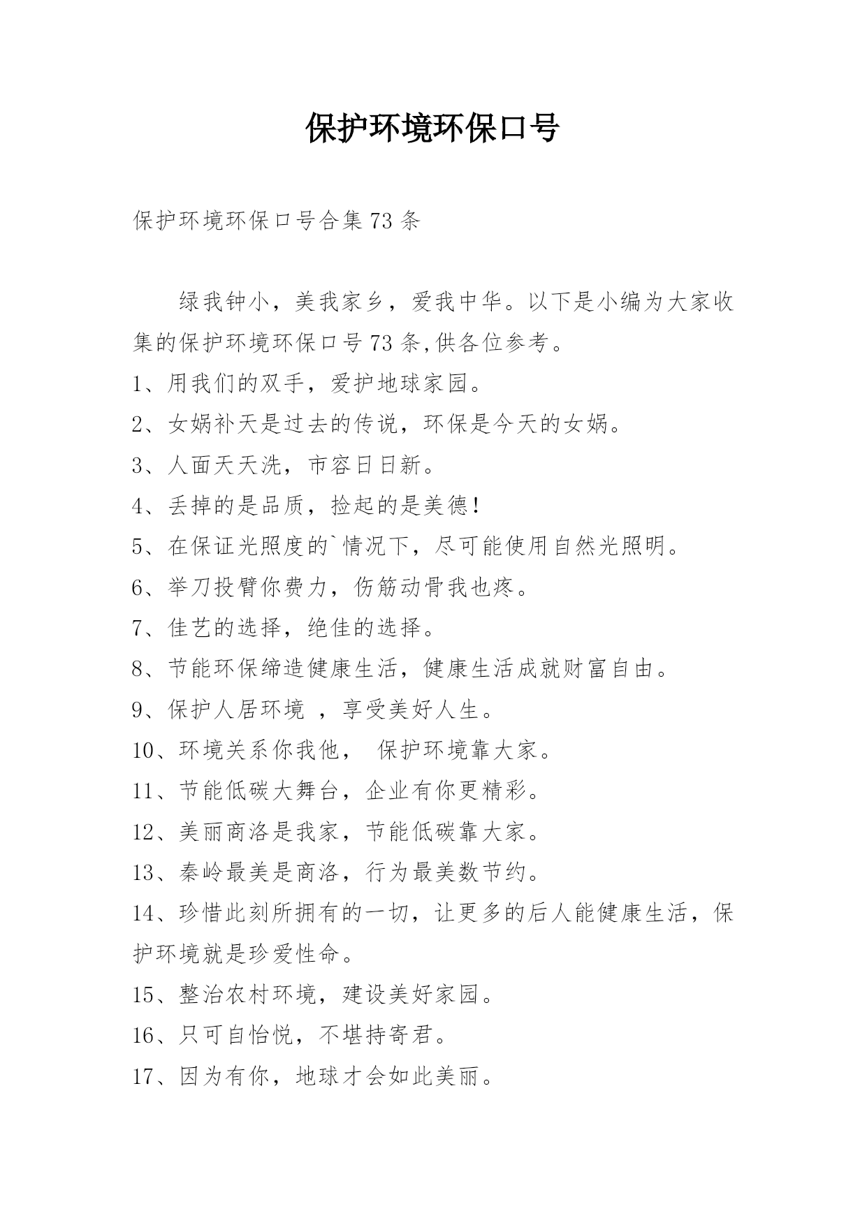 保护环境环保口号保护环境环保口号合集73条绿我钟小,美我家乡,爱我中华。以下是小编为大家收集的保护环境环保口号73条,供各位参考。1、用我们的双手,爱护地球家园。2、女娲补天是过去的传说,环保是今天的女娲。3、人面天天洗,市容日日新。4、丢掉的是品质,捡起的是美德!5、在保证光照度的`情况下,尽可能使用自然光照明。6、举刀投臂你费力,伤筋动骨我也疼。7、佳艺的选择,绝佳的选择。8、节能环保缔造健康生活,健康生活成就财富自由。9、保护人居环境,享受美好人生。10、环境关系你我他,保护环境靠大家。11、节能低