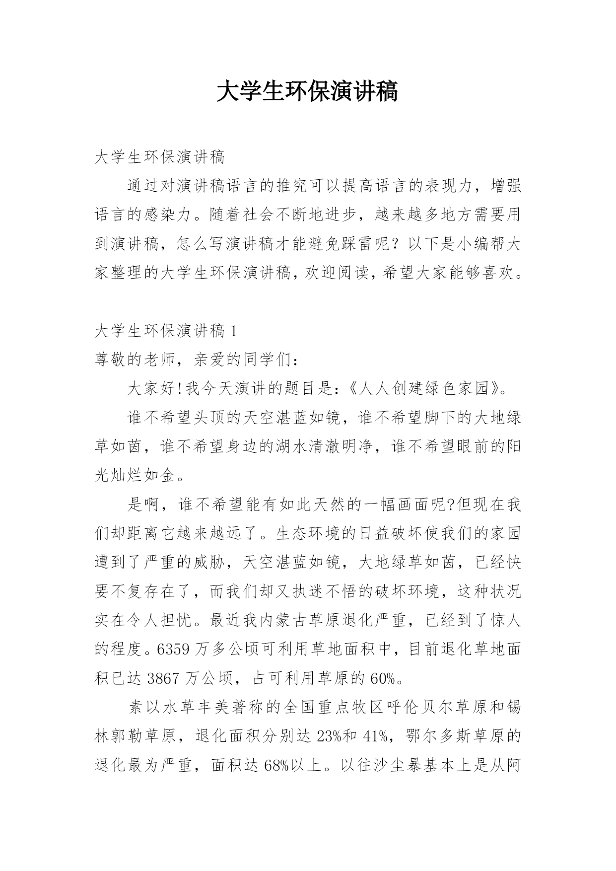 大学生环保演讲稿大学生环保演讲稿通过对演讲稿语言的推究可以提高语言的表现力,增强语言的感染力。随着社会不断地进步,越来越多地方需要用到演讲稿,怎么写演讲稿才能避免踩雷呢?以下是小编帮大家整理的大学生环保演讲稿,欢迎阅读,希望大家能够喜欢。大学生环保演讲稿1尊敬的老师,亲爱的同学们:大家好!我今天演讲的题目是:《人人创建绿色家园》。谁不希望头顶的天空湛蓝如镜,谁不希望脚下的大地绿草如茵,谁不希望身边的湖水清澈明净,谁不希望眼前的阳光灿烂如金。是啊,谁不希望能有如此天然的一幅画面呢?但现在我们却距离它越来越远