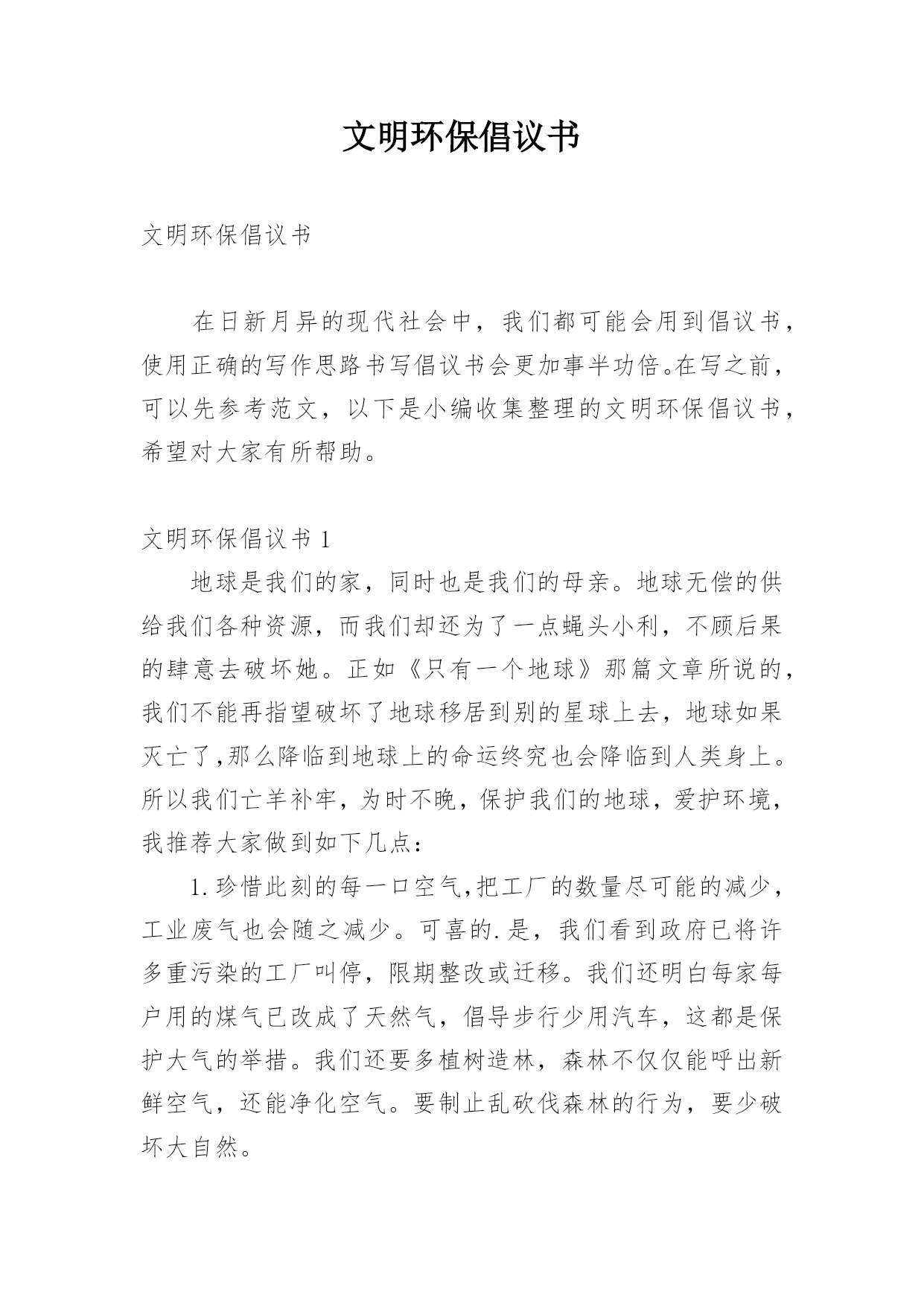 文明环保倡议书文明环保倡议书在日新月异的现代社会中,我们都可能会用到倡议书,使用正确的写作思路书写倡议书会更加事半功倍。在写之前,可以先参考范文,以下是小编收集整理的文明环保倡议书,希望对大家有所帮助。文明环保倡议书1地球是我们的家,同时也是我们的母亲。地球无偿的供给我们各种资源,而我们却还为了一点蝇头小利,不顾后果的肆意去破坏她。正如《只有一个地球》那篇文章所说的,我们不能再指望破坏了地球移居到别的星球上去,地球如果灭亡了,那么降临到地球上的命运终究也会降临到人类身上。所以我们亡羊补牢,为时不晚,保护我