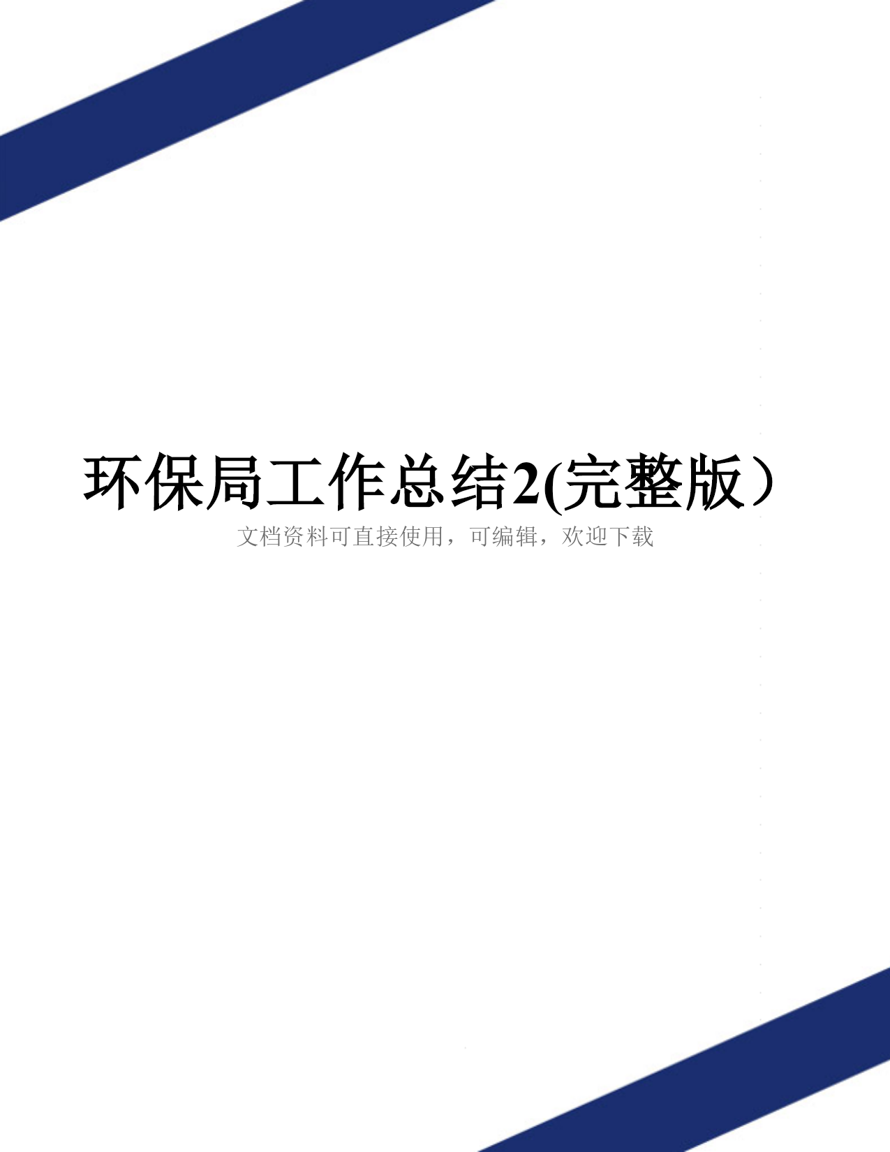 环保局工作总结2(完整版)文档资料可直接使用,可编辑,欢迎下载环保局工作总结尊敬的___同志,各位领导:大家好。根据区环境保护实绩考核要求,我局需就治污保洁工程完成情况和环保表现两个方面进行陈述。针对年度环保工作任务,我局制定了专项工作计划,并将计划分解细化,将责任落实到相关科室。现将我局有关工作情况汇报如下:一、治污保洁工程完成情况根据年初区委给我局安排的治污保洁工程任务有___污水处理厂配套管网工程和___路三期工程。按照任务安排,我局精心___建设,按国家相关环保法律法规要求,在工程建设中严把环保关