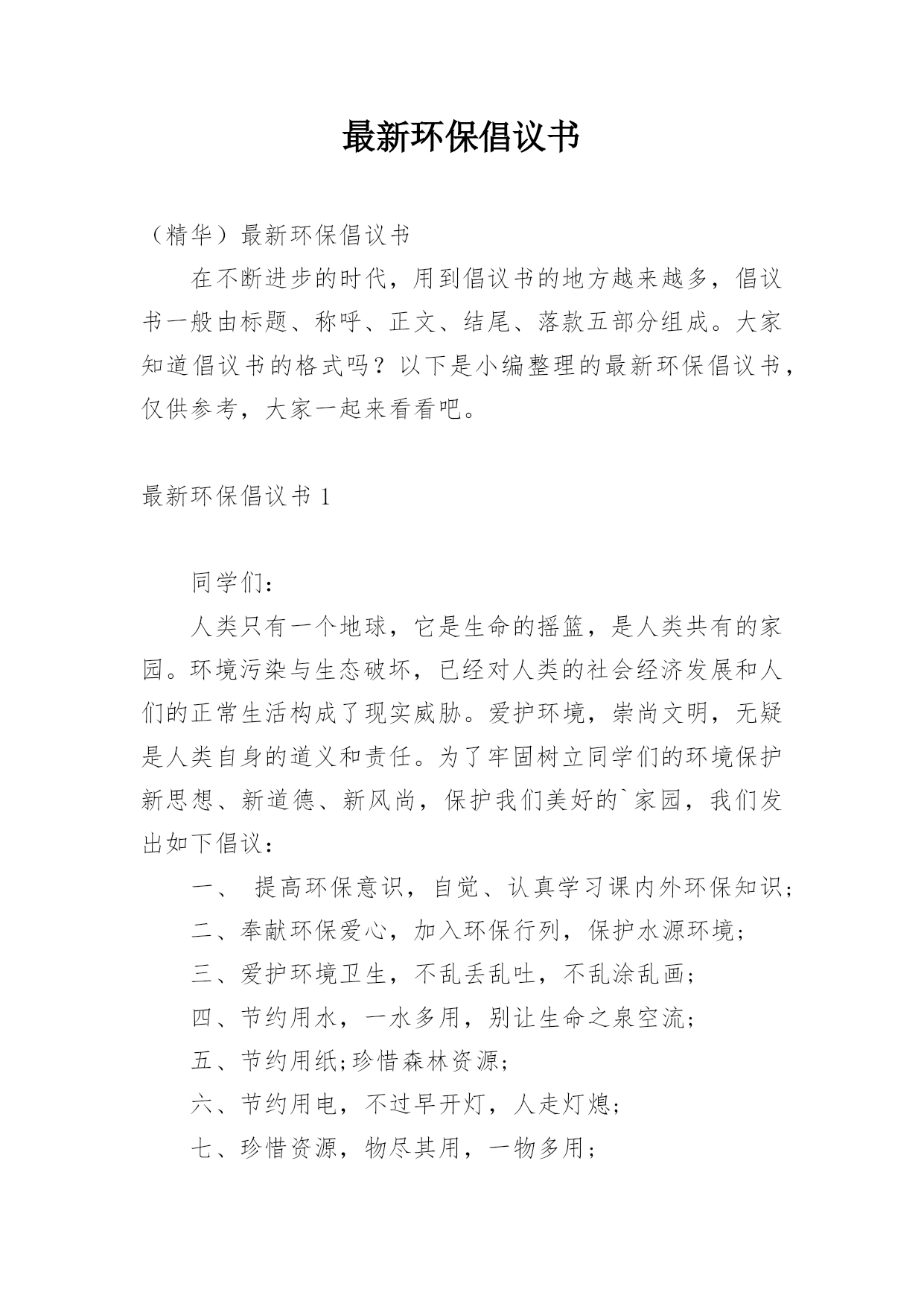 最新环保倡议书(精华)最新环保倡议书在不断进步的时代,用到倡议书的地方越来越多,倡议书一般由标题、称呼、正文、结尾、落款五部分组成。大家知道倡议书的格式吗?以下是小编整理的最新环保倡议书,仅供参考,大家一起来看看吧。最新环保倡议书1同学们:人类只有一个地球,它是生命的摇篮,是人类共有的家园。环境污染与生态破坏,已经对人类的社会经济发展和人们的正常生活构成了现实威胁。爱护环境,崇尚文明,无疑是人类自身的道义和责任。为了牢固树立同学们的环境保护新思想、新道德、新风尚,保护我们美好的`家园,我们发出如下倡议:一