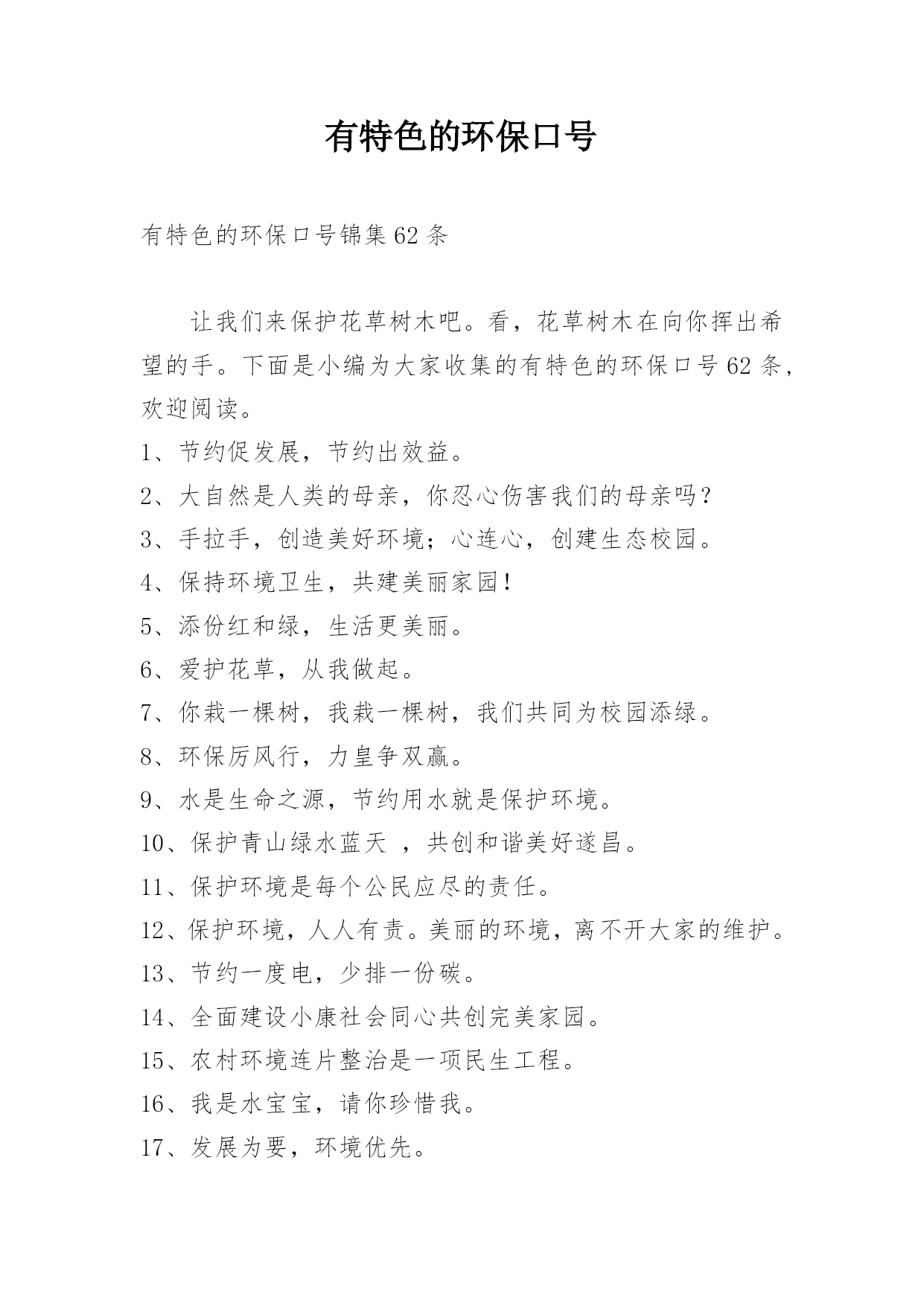 有特色的环保口号有特色的环保口号锦集62条让我们来保护花草树木吧。看,花草树木在向你挥出希望的手。下面是小编为大家收集的有特色的环保口号62条,欢迎阅读。1、节约促发展,节约出效益。2、大自然是人类的母亲,你忍心伤害我们的母亲吗?3、手拉手,创造美好环境;心连心,创建生态校园。4、保持环境卫生,共建美丽家园!5、添份红和绿,生活更美丽。6、爱护花草,从我做起。7、你栽一棵树,我栽一棵树,我们共同为校园添绿。8、环保厉风行,力皇争双赢。9、水是生命之源,节约用水就是保护环境。10、保护青山绿水蓝天,共创和谐