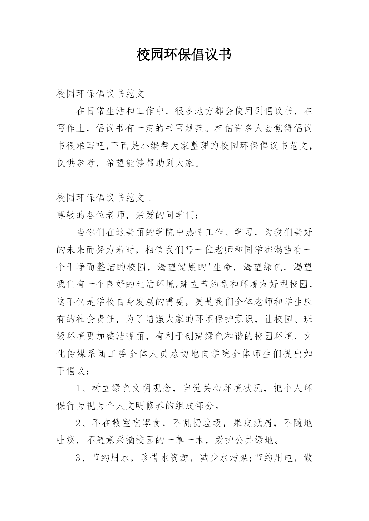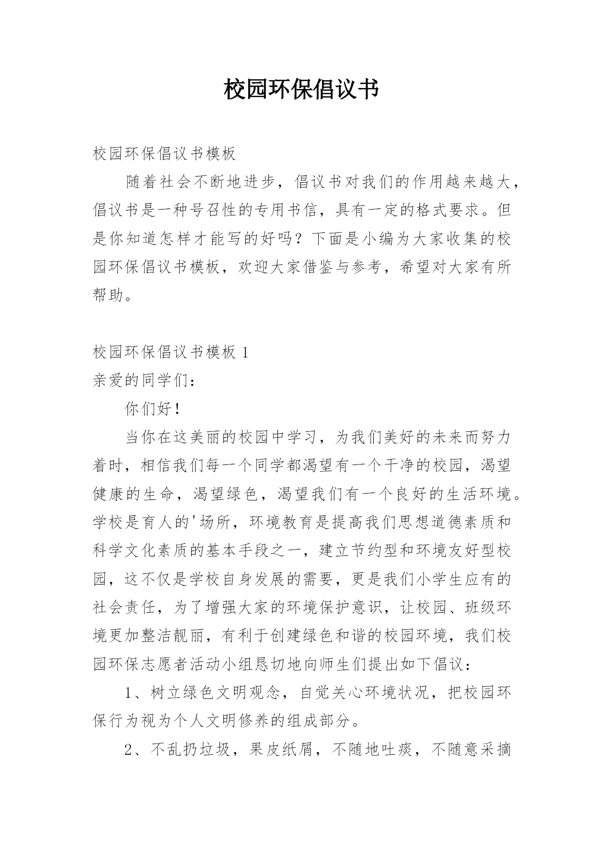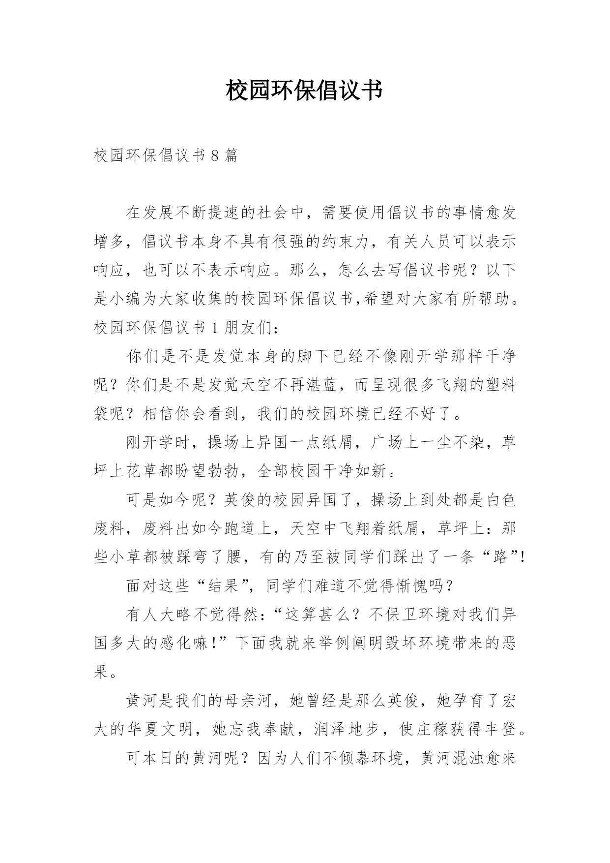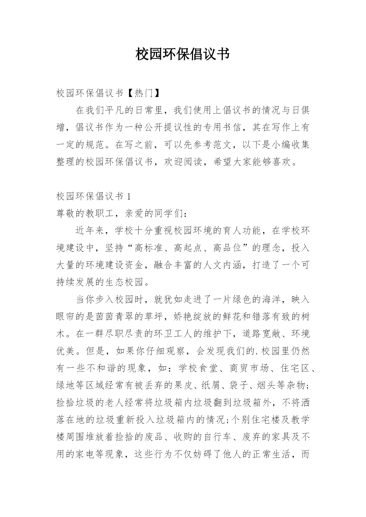 校园环保倡议书校园环保倡议书【热门】在我们平凡的日常里,我们使用上倡议书的情况与日俱增,倡议书作为一种公开提议性的专用书信,其在写作上有一定的规范。在写之前,可以先参考范文,以下是小编收集整理的校园环保倡议书,欢迎阅读,希望大家能够喜欢。校园环保倡议书1尊敬的教职工,亲爱的同学们:近年来,学校十分重视校园环境的育人功能,在学校环境建设中,坚持“高标准、高起点、高品位”的理念,投入大量的环境建设资金,融合丰富的人文内涵,打造了一个可持续发展的生态校园。当你步入校园时,就犹如走进了一片绿色的海洋,映入眼帘的是