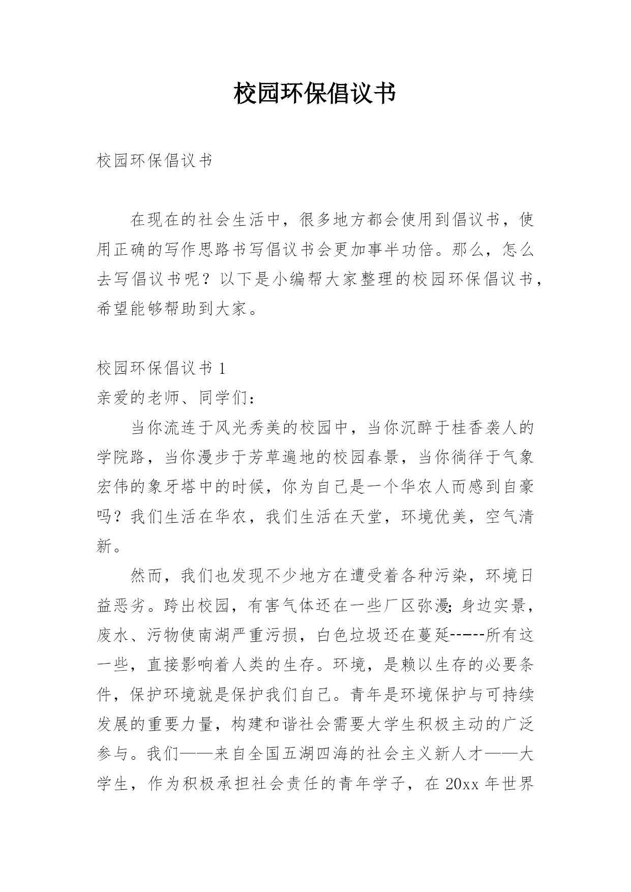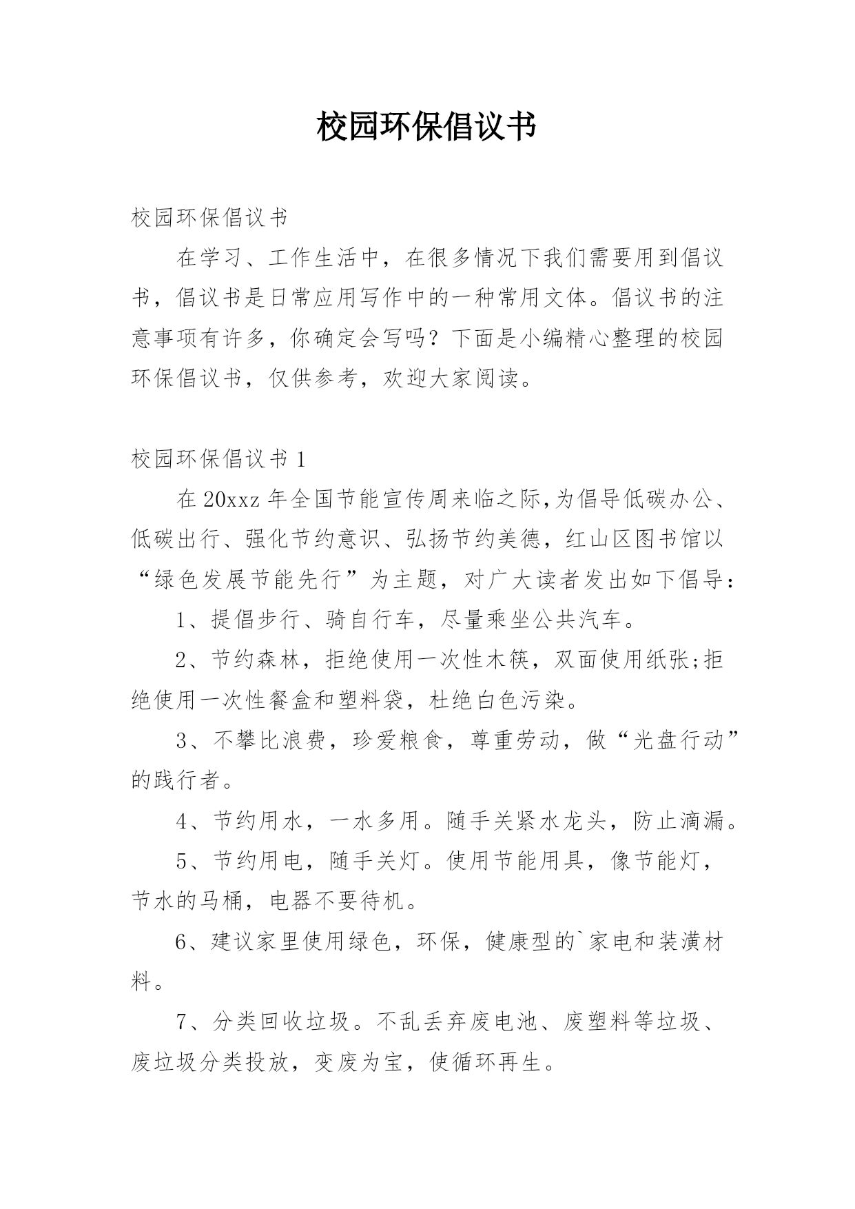 校园环保倡议书校园环保倡议书在学习、工作生活中,在很多情况下我们需要用到倡议书,倡议书是日常应用写作中的一种常用文体。倡议书的注意事项有许多,你确定会写吗?下面是小编精心整理的校园环保倡议书,仅供参考,欢迎大家阅读。校园环保倡议书1在20xxz年全国节能宣传周来临之际,为倡导低碳办公、低碳出行、强化节约意识、弘扬节约美德,红山区图书馆以“绿色发展节能先行”为主题,对广大读者发出如下倡导:1、提倡步行、骑自行车,尽量乘坐公共汽车。2、节约森林,拒绝使用一次性木筷,双面使用纸张;拒绝使用一次性餐盒和塑料袋,杜