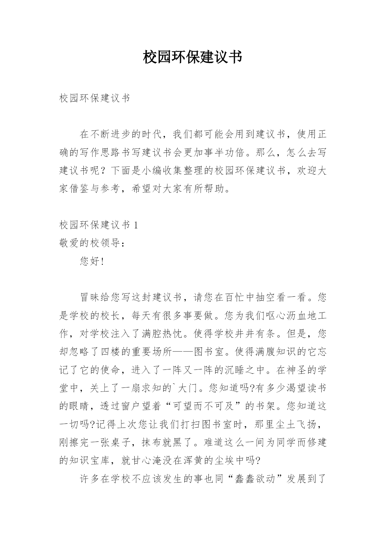 校园环保建议书校园环保建议书在不断进步的时代,我们都可能会用到建议书,使用正确的写作思路书写建议书会更加事半功倍。那么,怎么去写建议书呢?下面是小编收集整理的校园环保建议书,欢迎大家借鉴与参考,希望对大家有所帮助。校园环保建议书1敬爱的校领导:您好!冒昧给您写这封建议书,请您在百忙中抽空看一看。您是学校的校长,每天有很多事要做。您为我们呕心沥血地工作,对学校注入了满腔热忱。使得学校井井有条。但是,您却忽略了四楼的重要场所——图书室。使得满腹知识的它忘记了它的使命,进入了一阵又一阵的沉睡之中。在神圣的学堂中