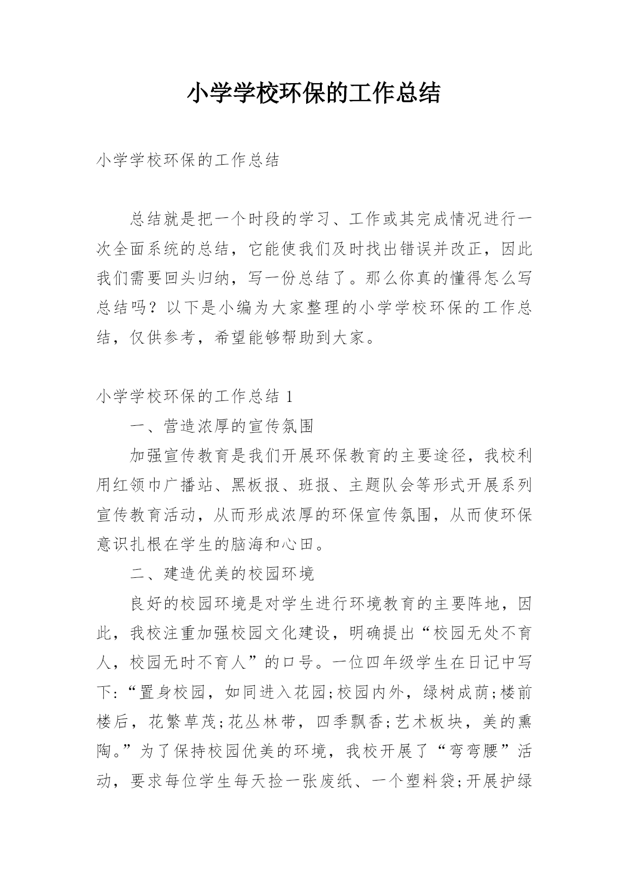 小学学校环保的工作总结小学学校环保的工作总结总结就是把一个时段的学习、工作或其完成情况进行一次全面系统的总结,它能使我们及时找出错误并改正,因此我们需要回头归纳,写一份总结了。那么你真的懂得怎么写总结吗?以下是小编为大家整理的小学学校环保的工作总结,仅供参考,希望能够帮助到大家。小学学校环保的工作总结1一、营造浓厚的宣传氛围加强宣传教育是我们开展环保教育的主要途径,我校利用红领巾广播站、黑板报、班报、主题队会等形式开展系列宣传教育活动,从而形成浓厚的环保宣传氛围,从而使环保意识扎根在学生的脑海和心田。二、