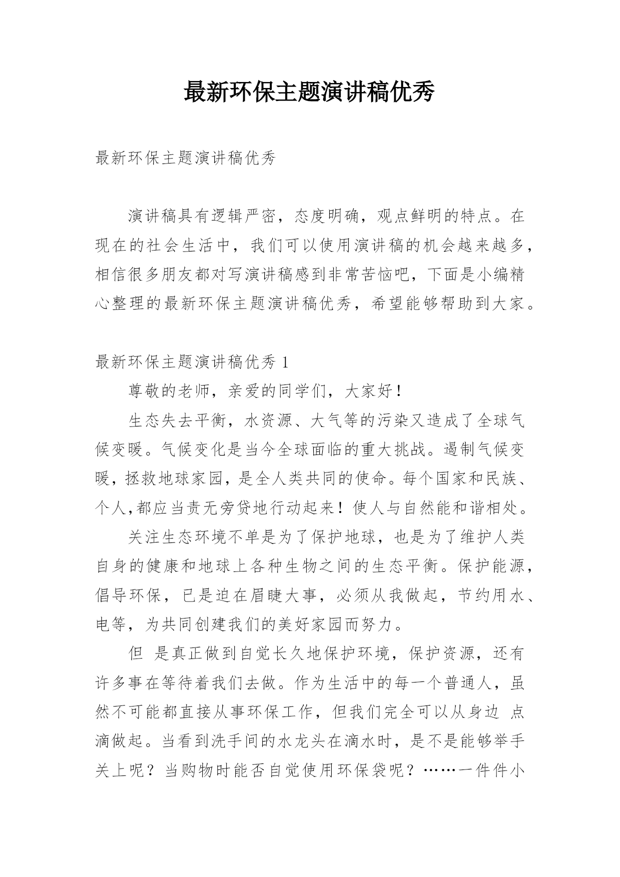 最新环保主题演讲稿优秀最新环保主题演讲稿优秀演讲稿具有逻辑严密,态度明确,观点鲜明的特点。在现在的社会生活中,我们可以使用演讲稿的机会越来越多,相信很多朋友都对写演讲稿感到非常苦恼吧,下面是小编精心整理的最新环保主题演讲稿优秀,希望能够帮助到大家。最新环保主题演讲稿优秀1尊敬的老师,亲爱的同学们,大家好!生态失去平衡,水资源、大气等的污染又造成了全球气候变暖。气候变化是当今全球面临的重大挑战。遏制气候变暖,拯救地球家园,是全人类共同的使命。每个国家和民族、个人,都应当责无旁贷地行动起来!使人与自然能和谐相