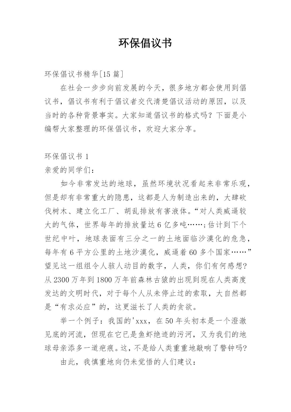 环保倡议书环保倡议书精华[15篇]在社会一步步向前发展的今天,很多地方都会使用到倡议书,倡议书有利于倡议者交代清楚倡议活动的原因,以及当时的各种背景事实。大家知道倡议书的格式吗?下面是小编帮大家整理的环保倡议书,欢迎大家分享。环保倡议书1亲爱的同学们:如今非常发达的地球,虽然环境状况看起来非常乐观,但是却有非常重大的隐患,这都是人为制造出来的,大肆砍伐树木、建立化工厂、胡乱排放有害液体。“对人类威逼较大的气体,世界每年的排放量达6亿多吨……;估计到下个世纪中叶,地球表面有三分之一的土地面临沙漠化的危急,每