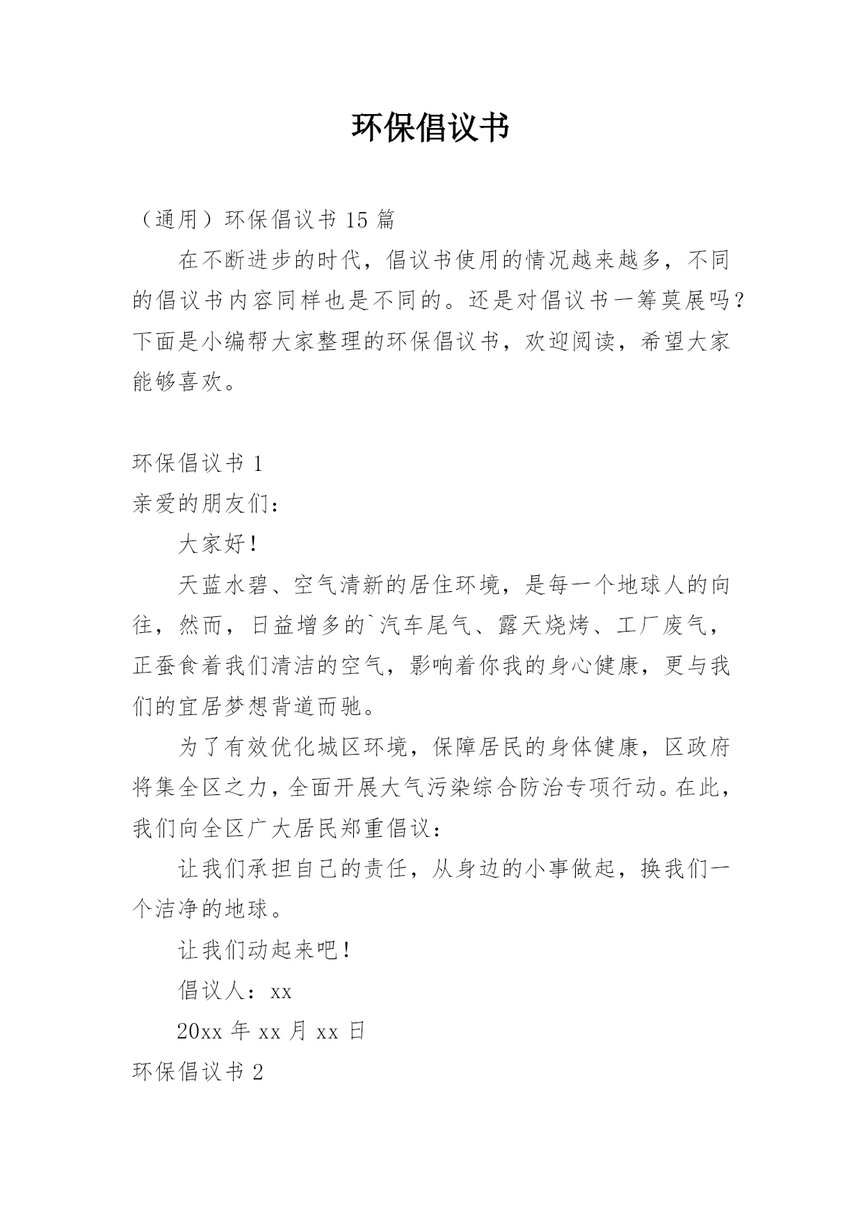 环保倡议书(通用)环保倡议书15篇在不断进步的时代,倡议书使用的情况越来越多,不同的倡议书内容同样也是不同的。还是对倡议书一筹莫展吗?下面是小编帮大家整理的环保倡议书,欢迎阅读,希望大家能够喜欢。环保倡议书1亲爱的朋友们:大家好!天蓝水碧、空气清新的居住环境,是每一个地球人的向往,然而,日益增多的`汽车尾气、露天烧烤、工厂废气,正蚕食着我们清洁的空气,影响着你我的身心健康,更与我们的宜居梦想背道而驰。为了有效优化城区环境,保障居民的身体健康,区政府将集全区之力,全面开展大气污染综合防治专项行动。在此,我们