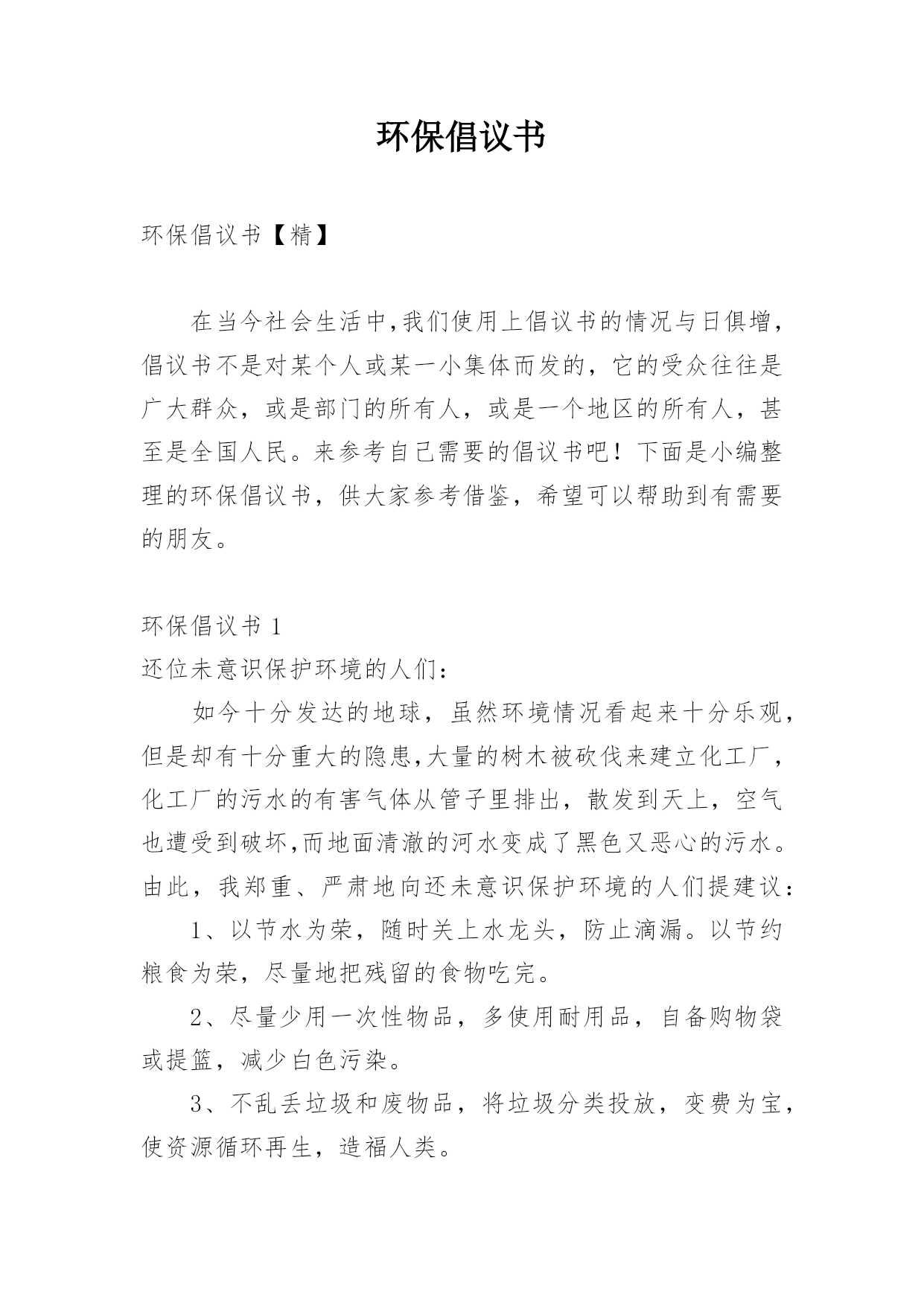 环保倡议书环保倡议书【精】在当今社会生活中,我们使用上倡议书的情况与日俱增,倡议书不是对某个人或某一小集体而发的,它的受众往往是广大群众,或是部门的所有人,或是一个地区的所有人,甚至是全国人民。来参考自己需要的倡议书吧!下面是小编整理的环保倡议书,供大家参考借鉴,希望可以帮助到有需要的朋友。环保倡议书1还位未意识保护环境的人们:如今十分发达的地球,虽然环境情况看起来十分乐观,但是却有十分重大的隐患,大量的树木被砍伐来建立化工厂,化工厂的污水的有害气体从管子里排出,散发到天上,空气也遭受到破坏,而地面清澈的
