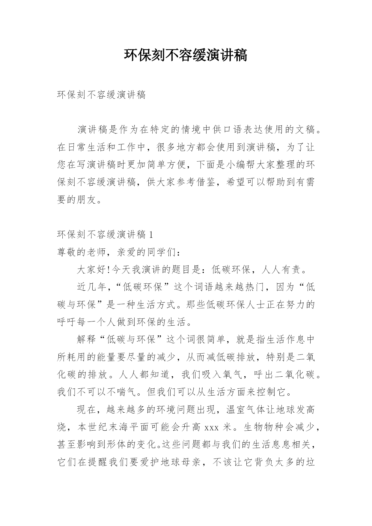 环保刻不容缓演讲稿环保刻不容缓演讲稿演讲稿是作为在特定的情境中供口语表达使用的文稿。在日常生活和工作中,很多地方都会使用到演讲稿,为了让您在写演讲稿时更加简单方便,下面是小编帮大家整理的环保刻不容缓演讲稿,供大家参考借鉴,希望可以帮助到有需要的朋友。环保刻不容缓演讲稿1尊敬的老师,亲爱的同学们:大家好!今天我演讲的题目是:低碳环保,人人有责。近几年,“低碳环保”这个词语越来越热门,因为“低碳与环保”是一种生活方式。那些低碳环保人士正在努力的呼吁每一个人做到环保的生活。解释“低碳与环保”这个词很简单,就是指