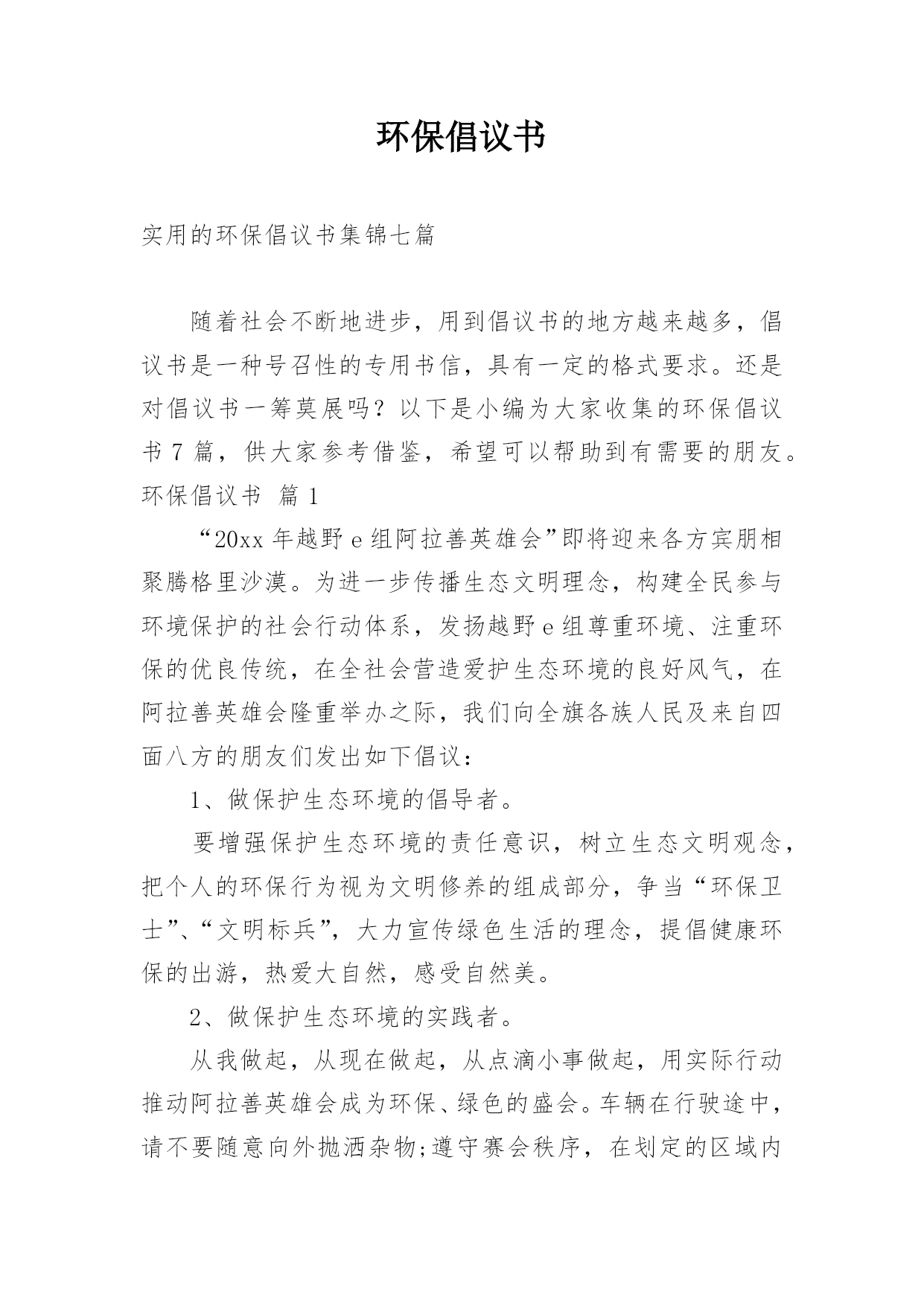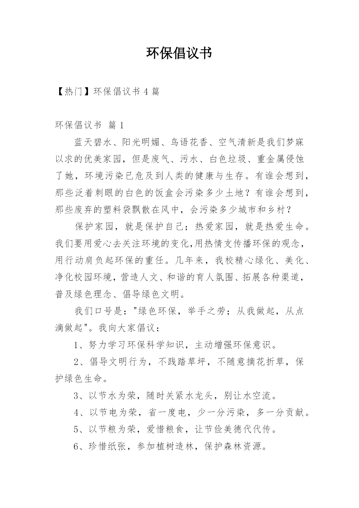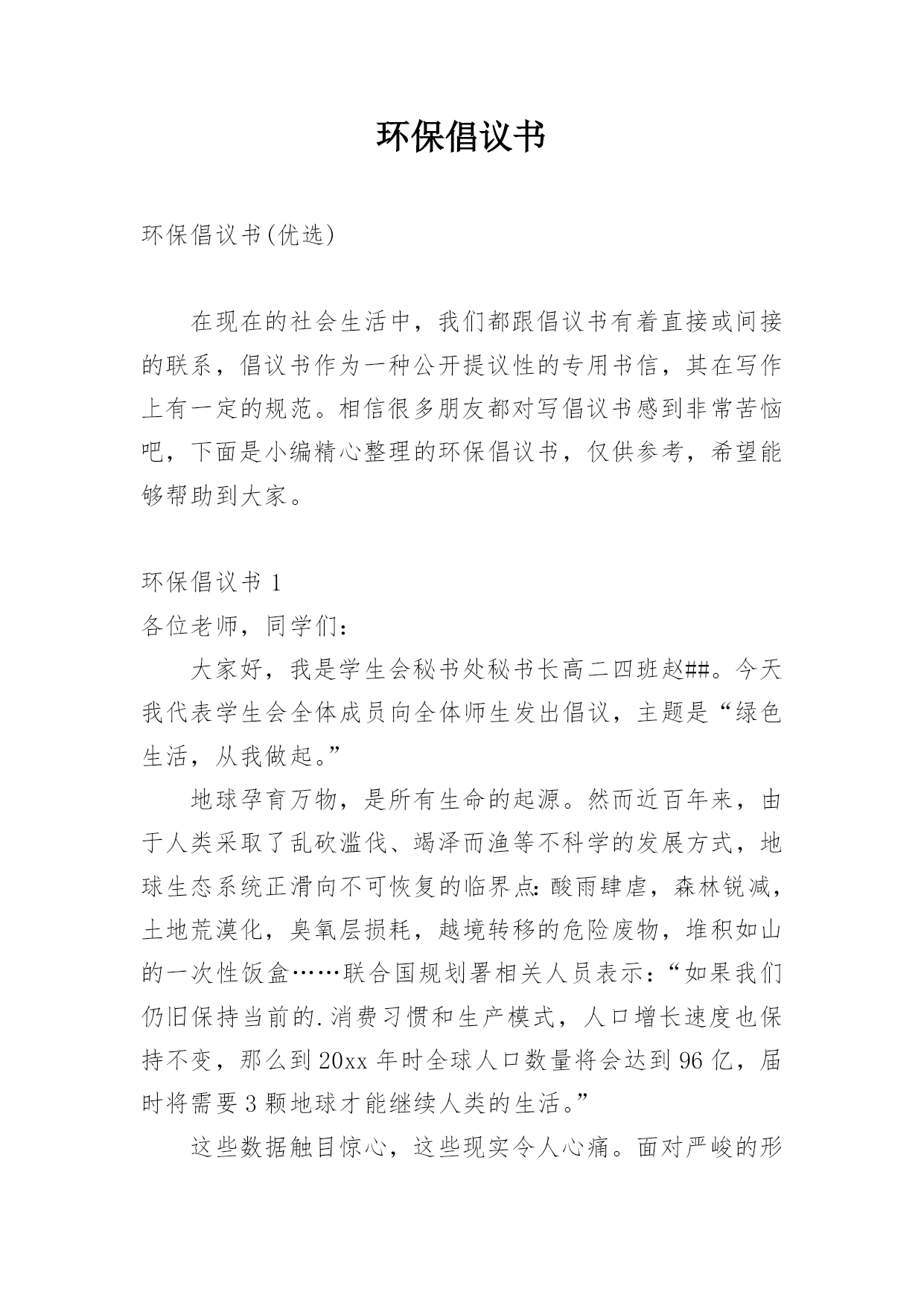 环保倡议书环保倡议书(优选)在现在的社会生活中,我们都跟倡议书有着直接或间接的联系,倡议书作为一种公开提议性的专用书信,其在写作上有一定的规范。相信很多朋友都对写倡议书感到非常苦恼吧,下面是小编精心整理的环保倡议书,仅供参考,希望能够帮助到大家。环保倡议书1各位老师,同学们:大家好,我是学生会秘书处秘书长高二四班赵##。今天我代表学生会全体成员向全体师生发出倡议,主题是“绿色生活,从我做起。”地球孕育万物,是所有生命的起源。然而近百年来,由于人类采取了乱砍滥伐、竭泽而渔等不科学的发展方式,地球生态系统正滑