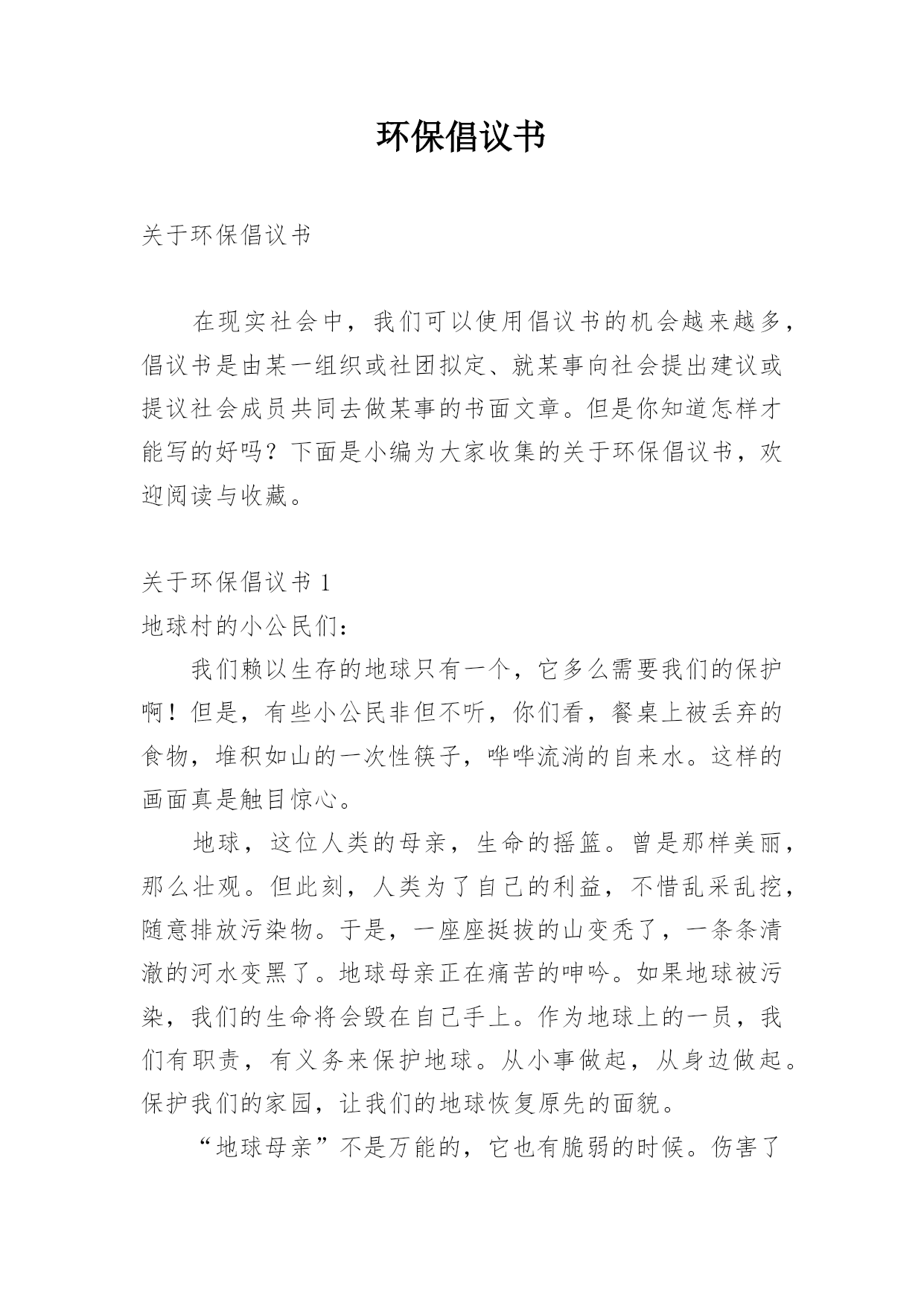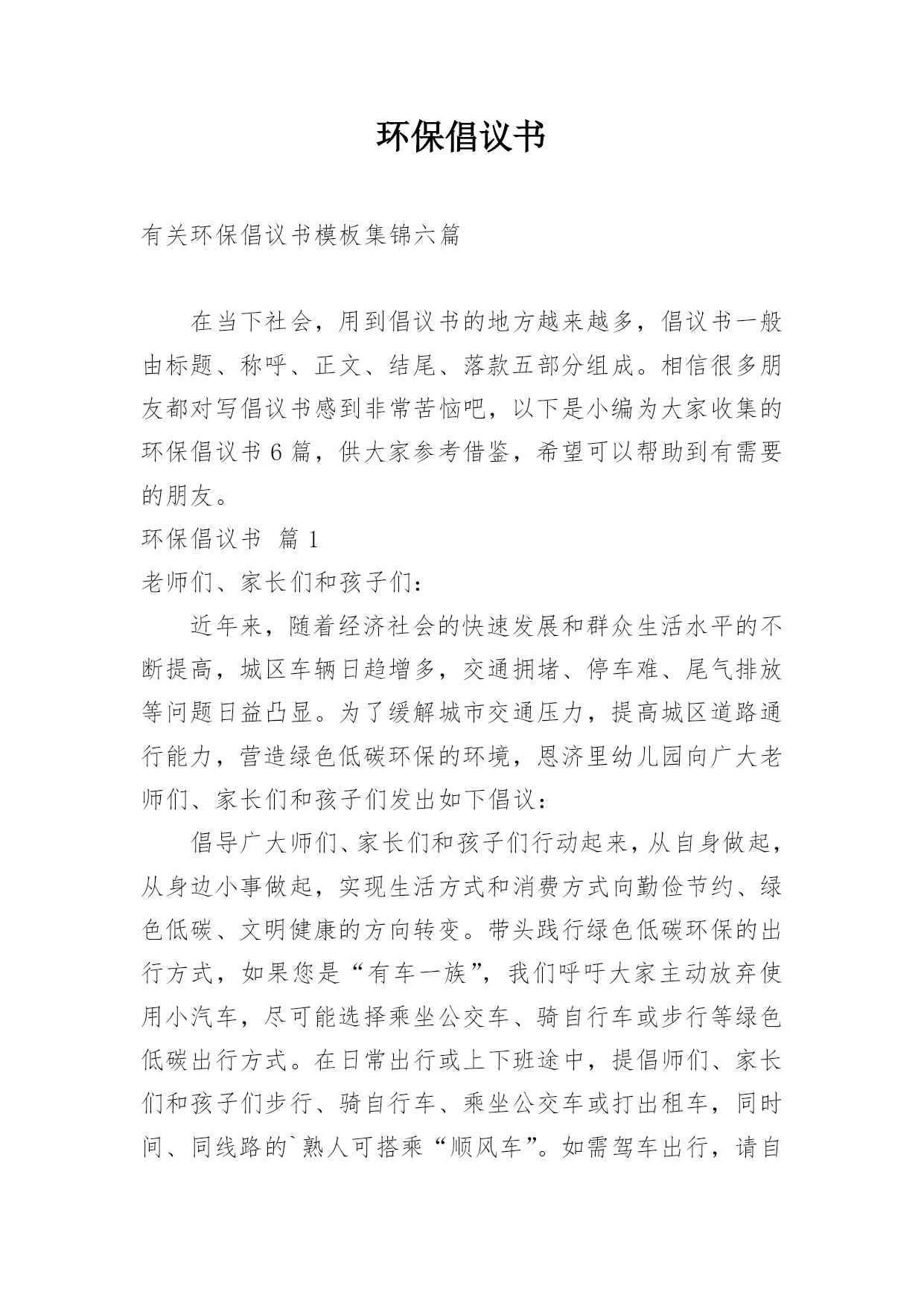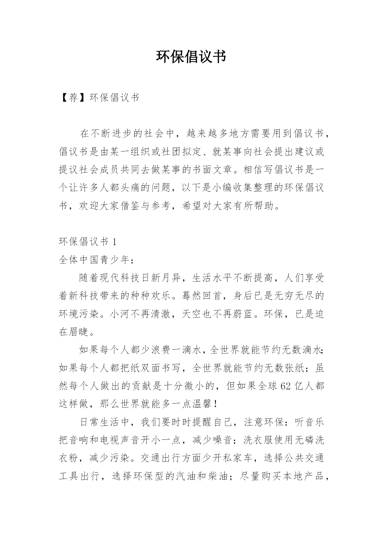 环保倡议书环保倡议书(优选)在现在的社会生活中,我们都跟倡议书有着直接或间接的联系,倡议书作为一种公开提议性的专用书信,其在写作上有一定的规范。相信很多朋友都对写倡议书感到非常苦恼吧,下面是小编精心整理的环保倡议书,仅供参考,希望能够帮助到大家。环保倡议书1各位老师,同学们:大家好,我是学生会秘书处秘书长高二四班赵##。今天我代表学生会全体成员向全体师生发出倡议,主题是“绿色生活,从我做起。”地球孕育万物,是所有生命的起源。然而近百年来,由于人类采取了乱砍滥伐、竭泽而渔等不科学的发展方式,地球生态系统正滑