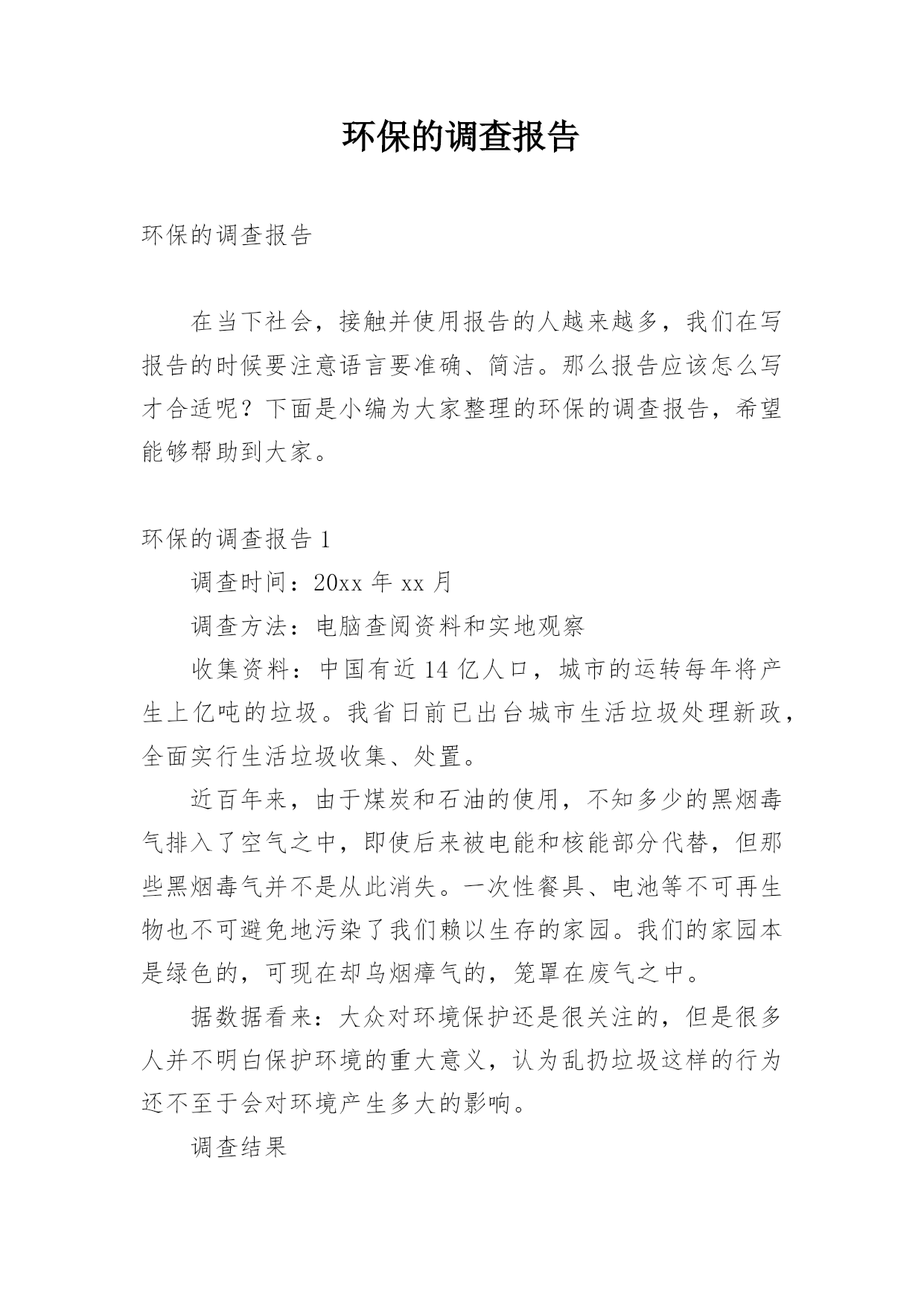 环保的调查报告环保的调查报告在当下社会,接触并使用报告的人越来越多,我们在写报告的时候要注意语言要准确、简洁。那么报告应该怎么写才合适呢?下面是小编为大家整理的环保的调查报告,希望能够帮助到大家。环保的调查报告1调查时间:20xx年xx月调查方法:电脑查阅资料和实地观察收集资料:中国有近14亿人口,城市的运转每年将产生上亿吨的垃圾。我省日前已出台城市生活垃圾处理新政,全面实行生活垃圾收集、处置。近百年来,由于煤炭和石油的使用,不知多少的黑烟毒气排入了空气之中,即使后来被电能和核能部分代替,但那些黑烟毒气并