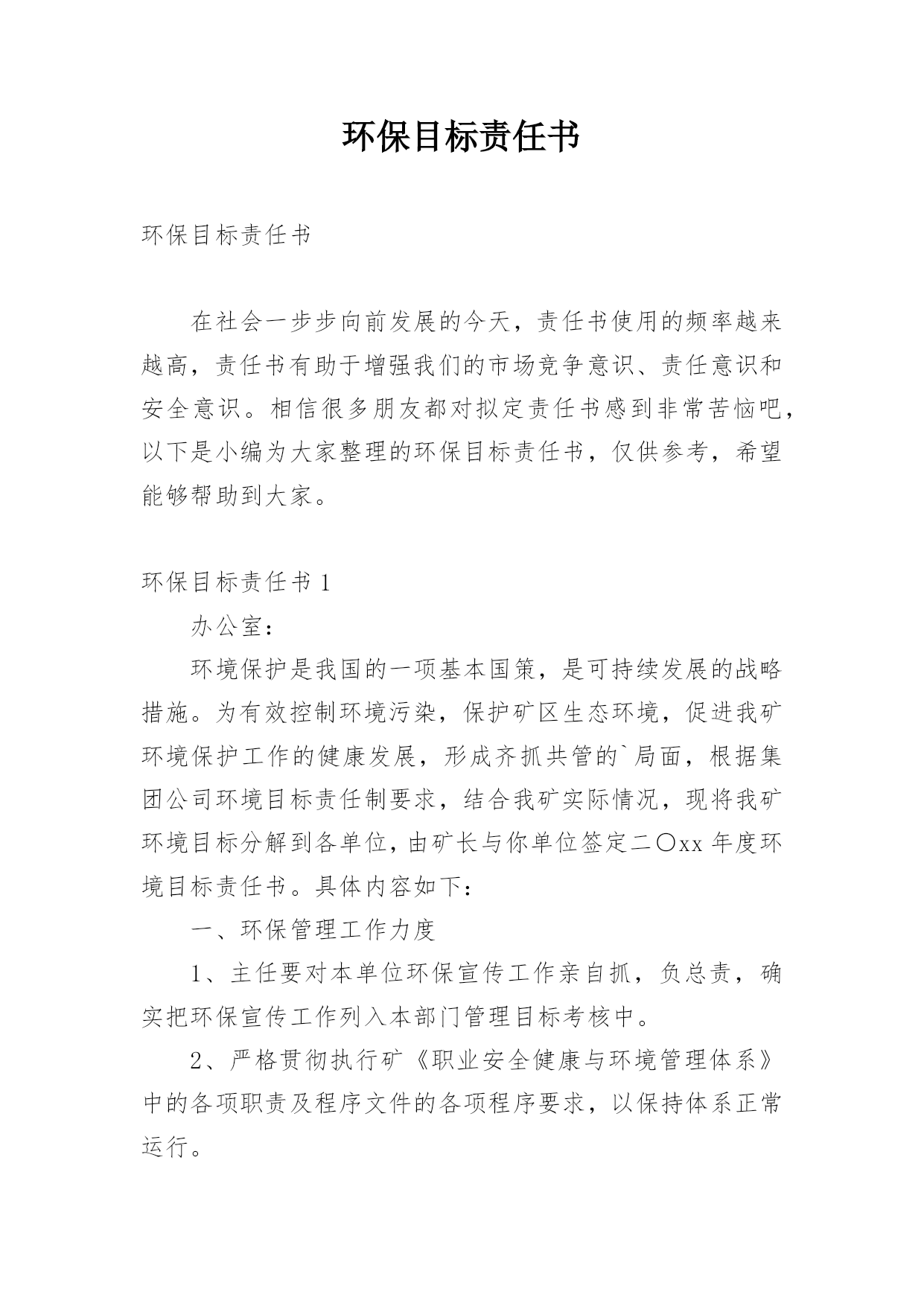 环保目标责任书环保目标责任书在社会一步步向前发展的今天,责任书使用的频率越来越高,责任书有助于增强我们的市场竞争意识、责任意识和安全意识。相信很多朋友都对拟定责任书感到非常苦恼吧,以下是小编为大家整理的环保目标责任书,仅供参考,希望能够帮助到大家。环保目标责任书1办公室:环境保护是我国的一项基本国策,是可持续发展的战略措施。为有效控制环境污染,保护矿区生态环境,促进我矿环境保护工作的健康发展,形成齐抓共管的`局面,根据集团公司环境目标责任制要求,结合我矿实际情况,现将我矿环境目标分解到各单位,由矿长与你单