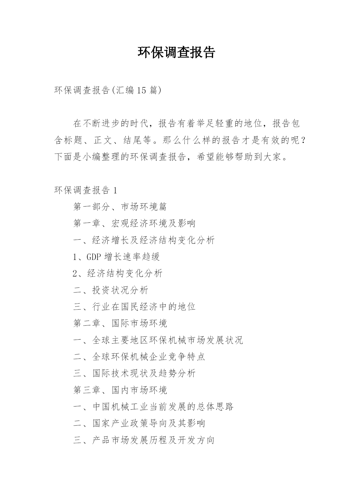 环保调查报告环保调查报告(汇编15篇)在不断进步的时代,报告有着举足轻重的地位,报告包含标题、正文、结尾等。那么什么样的报告才是有效的呢?下面是小编整理的环保调查报告,希望能够帮助到大家。环保调查报告1第一部分、市场环境篇第一章、宏观经济环境及影响一、经济增长及经济结构变化分析1、GDP增长速率趋缓2、经济结构变化分析二、投资状况分析三、行业在国民经济中的地位第二章、国际市场环境一、全球主要地区环保机械市场发展状况二、全球环保机械企业竞争特点三、国际技术现状及趋势分析第三章、国内市场环境一、中国机械工业当
