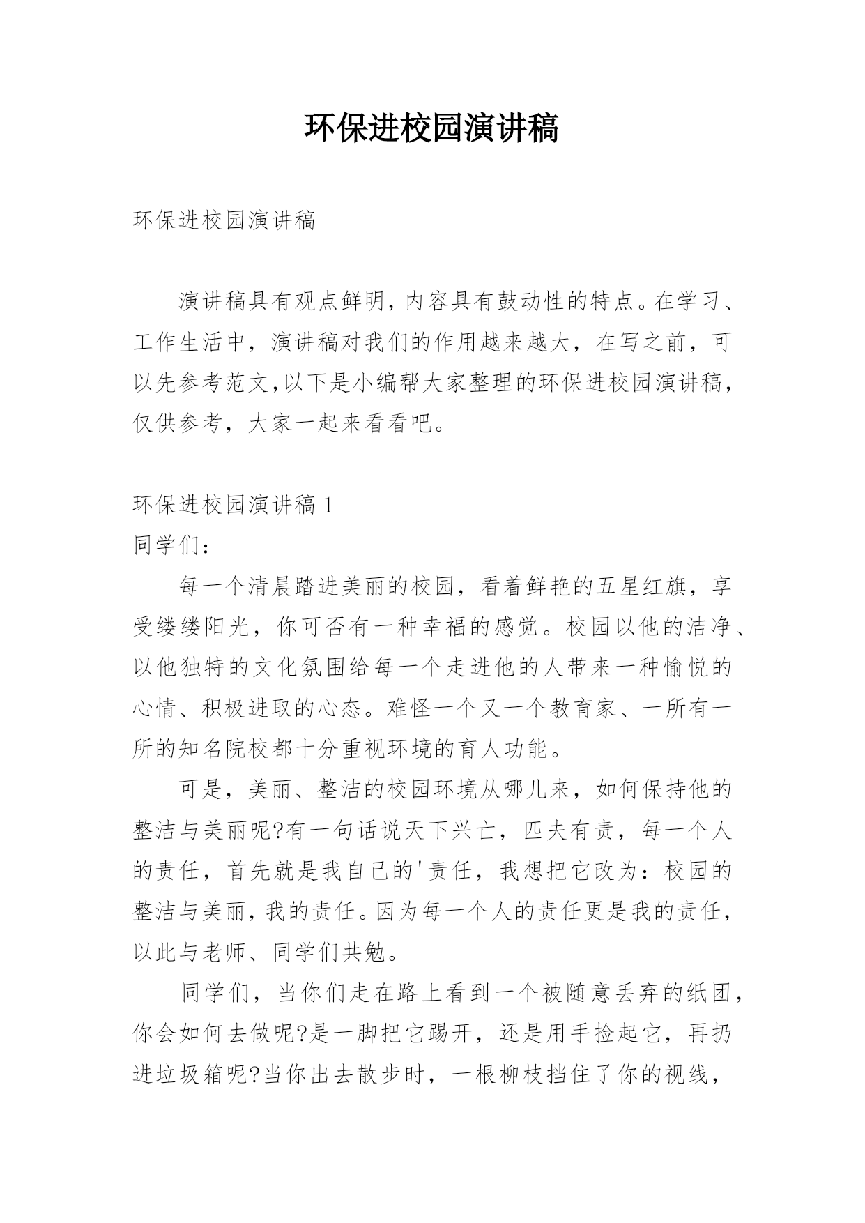 环保进校园演讲稿环保进校园演讲稿演讲稿具有观点鲜明,内容具有鼓动性的特点。在学习、工作生活中,演讲稿对我们的作用越来越大,在写之前,可以先参考范文,以下是小编帮大家整理的环保进校园演讲稿,仅供参考,大家一起来看看吧。环保进校园演讲稿1同学们:每一个清晨踏进美丽的校园,看着鲜艳的五星红旗,享受缕缕阳光,你可否有一种幸福的感觉。校园以他的洁净、以他独特的文化氛围给每一个走进他的人带来一种愉悦的心情、积极进取的心态。难怪一个又一个教育家、一所有一所的知名院校都十分重视环境的育人功能。可是,美丽、整洁的校园环境从