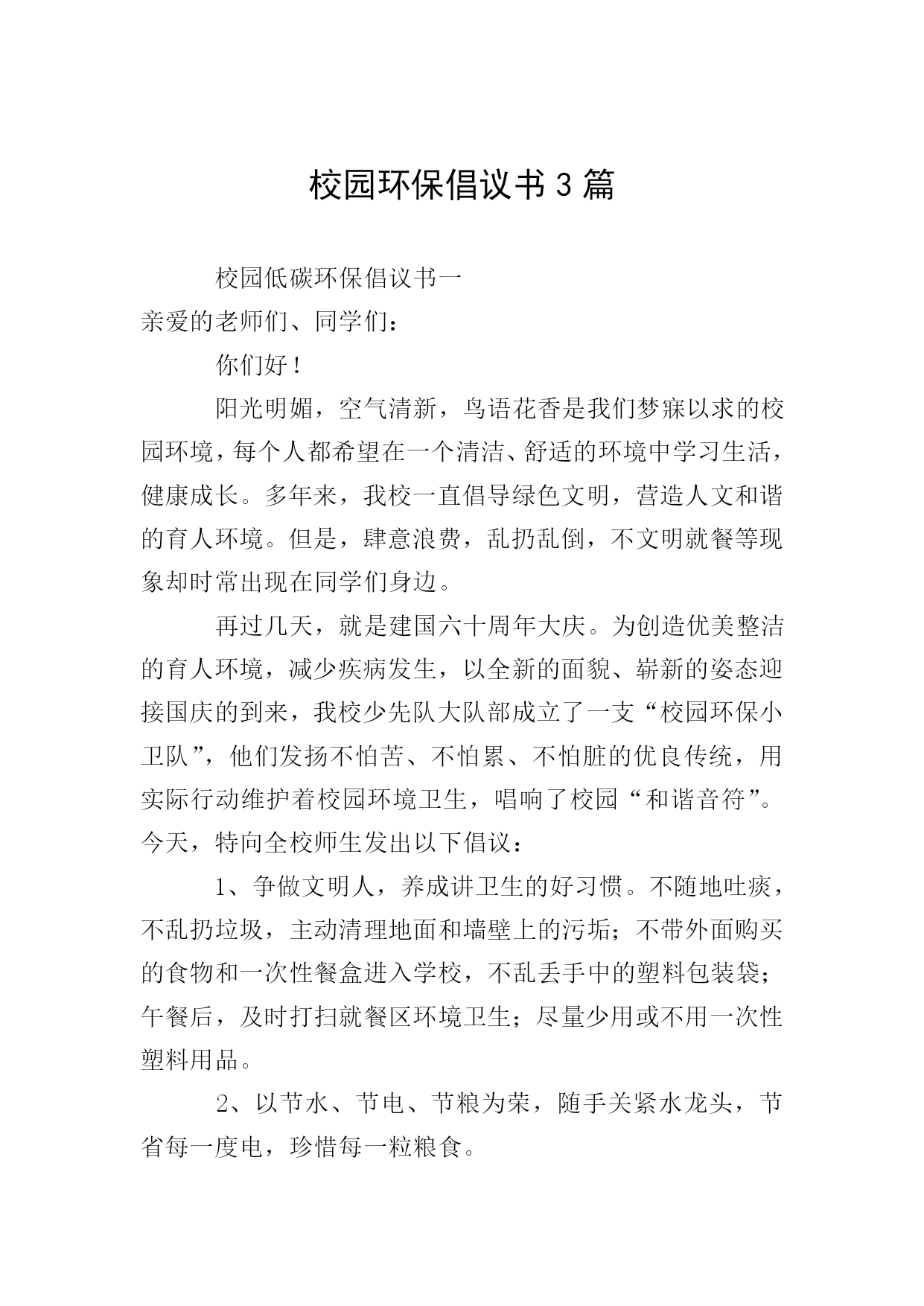 校园环保倡议书3篇校园低碳环保倡议书一亲爱的老师们、同学们:你们好!阳光明媚,空气清新,鸟语花香是我们梦寐以求的校园环境,每个人都希望在一个清洁、舒适的环境中学习生活,健康成长。多年来,我校一直倡导绿色文明,营造人文和谐的育人环境。但是,肆意浪费,乱扔乱倒,不文明就餐等现象却时常出现在同学们身边。再过几天,就是建国六十周年大庆。为创造优美整洁的育人环境,减少疾病发生,以全新的面貌、崭新的姿态迎接国庆的到来,我校少先队大队部成立了一支“校园环保小卫队”,他们发扬不怕苦、不怕累、不怕脏的优良传统,用实际行动维