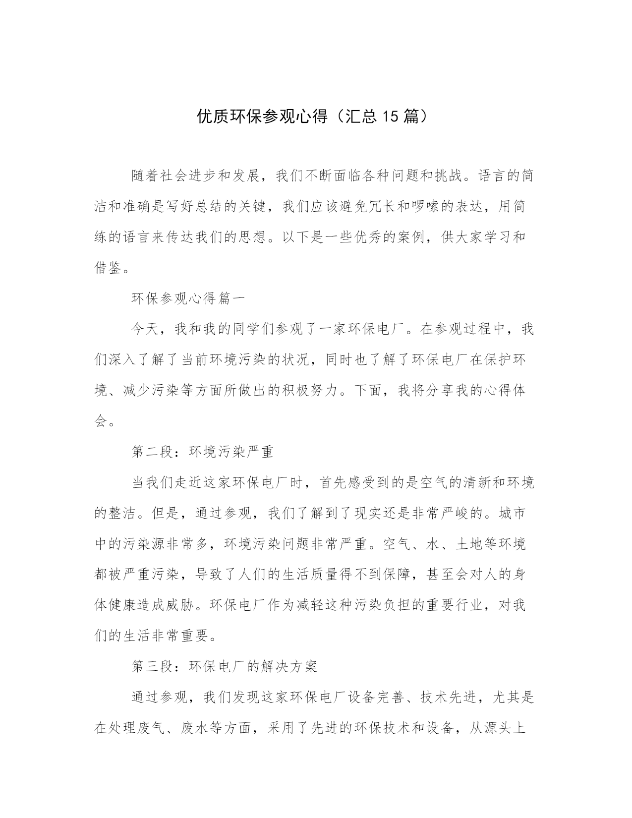 优质环保参观心得(汇总15篇)随着社会进步和发展,我们不断面临各种问题和挑战。语言的简洁和准确是写好总结的关键,我们应该避免冗长和啰嗦的表达,用简练的语言来传达我们的思想。以下是一些优秀的案例,供大家学习和借鉴。环保参观心得篇一今天,我和我的同学们参观了一家环保电厂。在参观过程中,我们深入了解了当前环境污染的状况,同时也了解了环保电厂在保护环境、减少污染等方面所做出的积极努力。下面,我将分享我的心得体会。第二段:环境污染严重当我们走近这家环保电厂时,首先感受到的是空气的清新和环境的整洁。但是,通过参观,我
