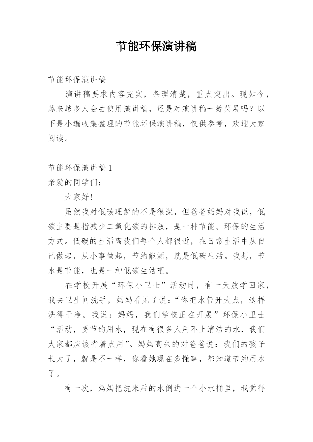 节能环保演讲稿节能环保演讲稿演讲稿要求内容充实,条理清楚,重点突出。现如今,越来越多人会去使用演讲稿,还是对演讲稿一筹莫展吗?以下是小编收集整理的节能环保演讲稿,仅供参考,欢迎大家阅读。节能环保演讲稿1亲爱的同学们:大家好!虽然我对低碳理解的不是很深,但爸爸妈妈对我说,低碳主要是指减少二氧化碳的排放,是一种节能、环保的生活方式。低碳的生活离我们每个人都很近,在日常生活中从自己做起,从小事做起,节约能源,就是低碳生活。我想,节水是节能,也是一种低碳生活吧。在学校开展“环保小卫士”活动时,有一天放学回家,我去