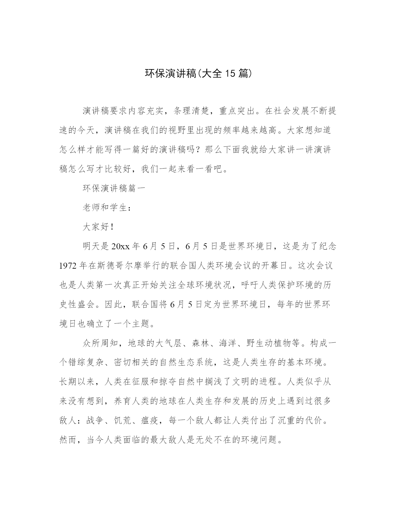 环保演讲稿(大全15篇)演讲稿要求内容充实,条理清楚,重点突出。在社会发展不断提速的今天,演讲稿在我们的视野里出现的频率越来越高。大家想知道怎么样才能写得一篇好的演讲稿吗?那么下面我就给大家讲一讲演讲稿怎么写才比较好,我们一起来看一看吧。环保演讲稿篇一老师和学生:大家好!明天是20xx年6月5日,6月5日是世界环境日,这是为了纪念1972年在斯德哥尔摩举行的联合国人类环境会议的开幕日。这次会议也是人类第一次真正开始关注全球环境状况,呼吁人类保护环境的历史性盛会。因此,联合国将6月5日定为世界环境日,每年的