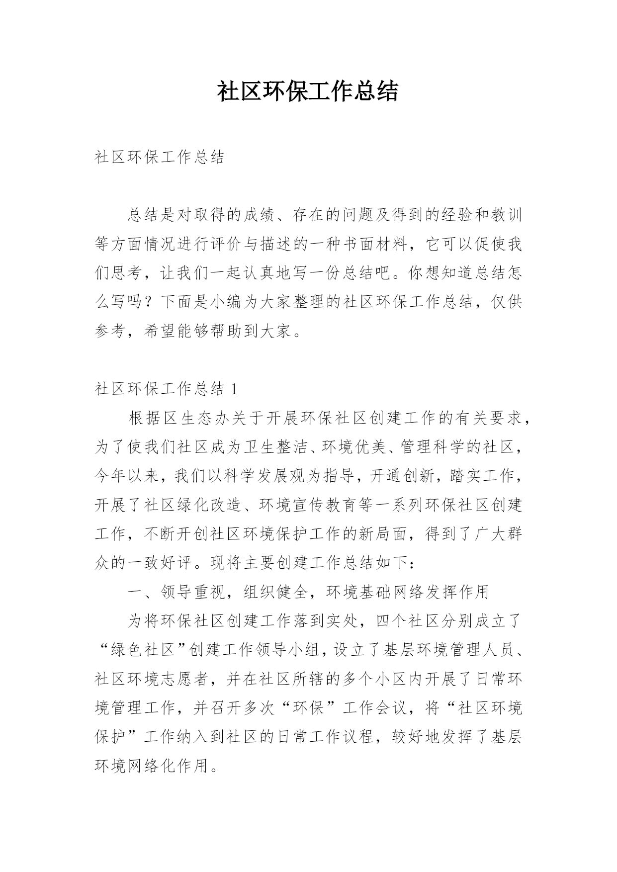 社区环保工作总结社区环保工作总结总结是对取得的成绩、存在的问题及得到的经验和教训等方面情况进行评价与描述的一种书面材料,它可以促使我们思考,让我们一起认真地写一份总结吧。你想知道总结怎么写吗?下面是小编为大家整理的社区环保工作总结,仅供参考,希望能够帮助到大家。社区环保工作总结1根据区生态办关于开展环保社区创建工作的有关要求,为了使我们社区成为卫生整洁、环境优美、管理科学的社区,今年以来,我们以科学发展观为指导,开通创新,踏实工作,开展了社区绿化改造、环境宣传教育等一系列环保社区创建工作,不断开创社区环境