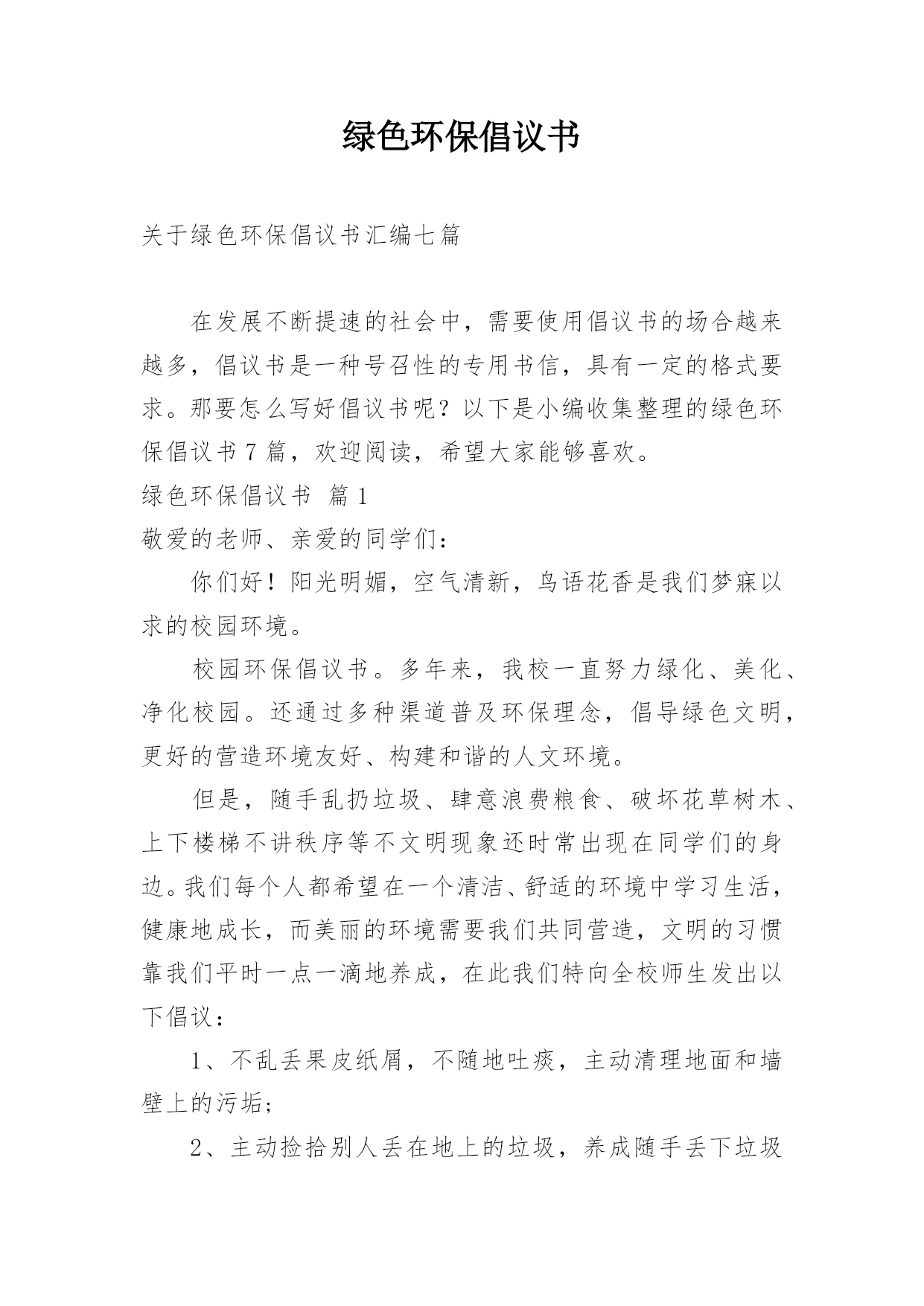 绿色环保倡议书关于绿色环保倡议书汇编七篇在发展不断提速的社会中,需要使用倡议书的场合越来越多,倡议书是一种号召性的专用书信,具有一定的格式要求。那要怎么写好倡议书呢?以下是小编收集整理的绿色环保倡议书7篇,欢迎阅读,希望大家能够喜欢。绿色环保倡议书篇1敬爱的老师、亲爱的同学们:你们好!阳光明媚,空气清新,鸟语花香是我们梦寐以求的校园环境。校园环保倡议书。多年来,我校一直努力绿化、美化、净化校园。还通过多种渠道普及环保理念,倡导绿色文明,更好的营造环境友好、构建和谐的人文环境。但是,随手乱扔垃圾、肆意浪费粮