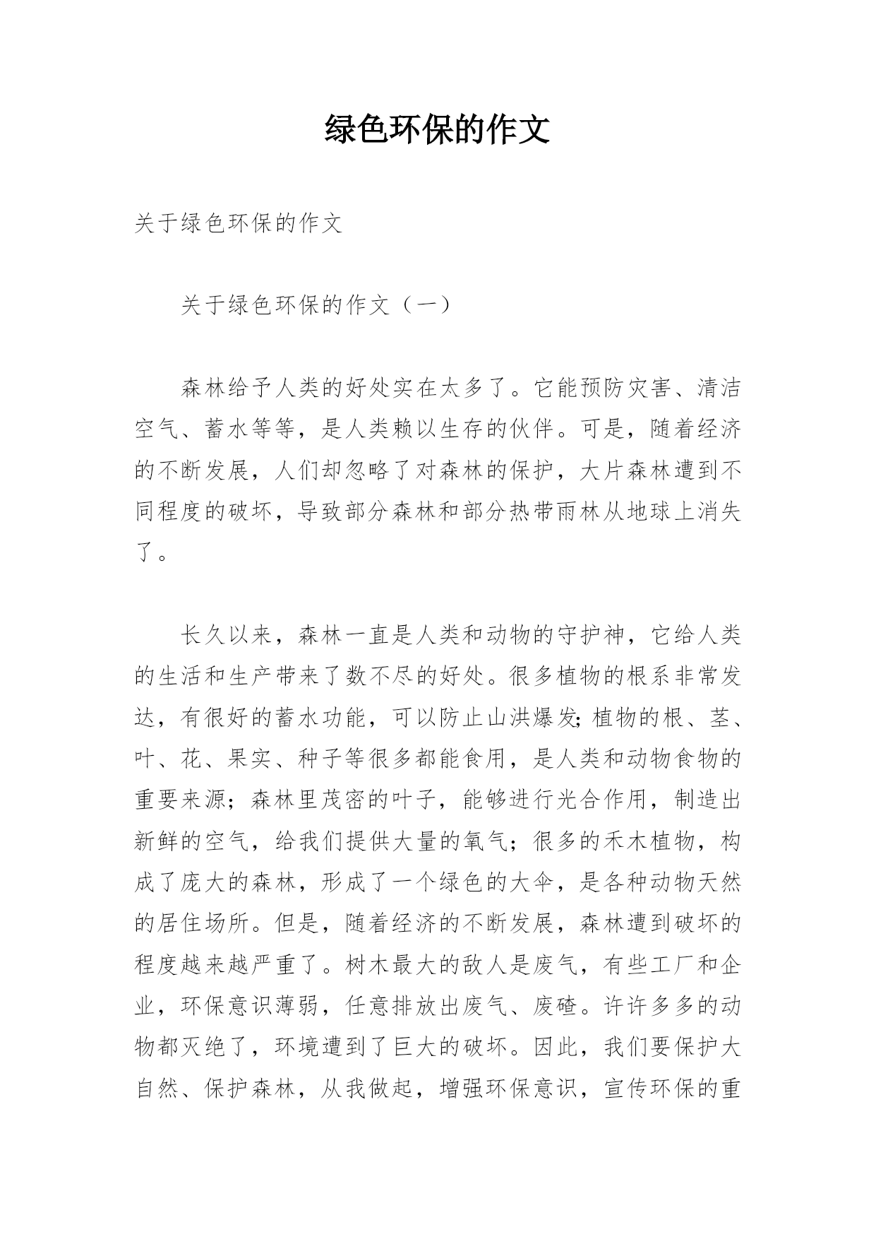 绿色环保的作文关于绿色环保的作文关于绿色环保的作文(一)森林给予人类的好处实在太多了。它能预防灾害、清洁空气、蓄水等等,是人类赖以生存的伙伴。可是,随着经济的不断发展,人们却忽略了对森林的保护,大片森林遭到不同程度的破坏,导致部分森林和部分热带雨林从地球上消失了。长久以来,森林一直是人类和动物的守护神,它给人类的生活和生产带来了数不尽的好处。很多植物的根系非常发达,有很好的蓄水功能,可以防止山洪爆发;植物的根、茎、叶、花、果实、种子等很多都能食用,是人类和动物食物的重要来源;森林里茂密的叶子,能够进行光合