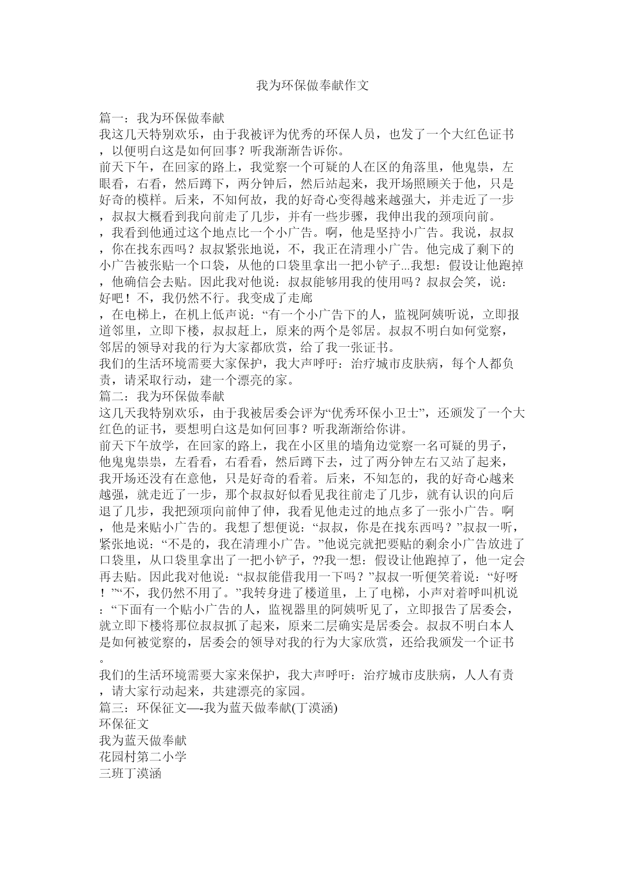 我为环保做奉献作文篇一:我为环保做奉献我这几天特别欢乐,由于我被评为优秀的环保人员,也发了一个大红色证书,以便明白这是如何回事?听我渐渐告诉你。前天下午,在回家的路上,我觉察一个可疑的人在区的角落里,他鬼祟,左眼看,右看,然后蹲下,两分钟后,然后站起来,我开场照顾关于他,只是好奇的模样。后来,不知何故,我的好奇心变得越来越强大,并走近了一步,叔叔大概看到我向前走了几步,并有一些步骤,我伸出我的颈项向前。,我看到他通过这个地点比一个小广告。啊,他是坚持小广告。我说,叔叔,你在找东西吗?叔叔紧张地说,不,我正