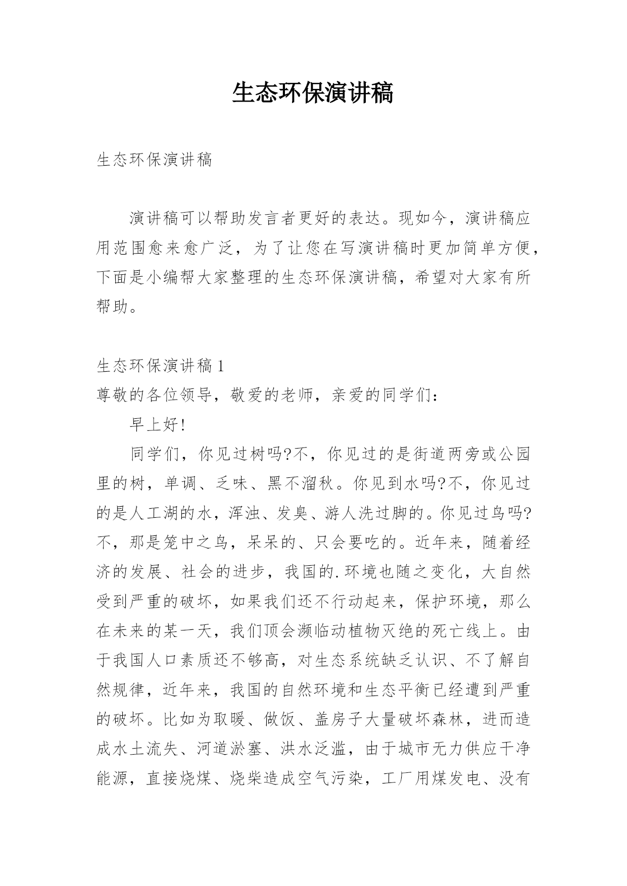 生态环保演讲稿生态环保演讲稿演讲稿可以帮助发言者更好的表达。现如今,演讲稿应用范围愈来愈广泛,为了让您在写演讲稿时更加简单方便,下面是小编帮大家整理的生态环保演讲稿,希望对大家有所帮助。生态环保演讲稿1尊敬的各位领导,敬爱的老师,亲爱的同学们:早上好!同学们,你见过树吗?不,你见过的是街道两旁或公园里的树,单调、乏味、黑不溜秋。你见到水吗?不,你见过的是人工湖的水,浑浊、发臭、游人洗过脚的。你见过鸟吗?不,那是笼中之鸟,呆呆的、只会要吃的。近年来,随着经济的发展、社会的进步,我国的.环境也随之变化,大自然