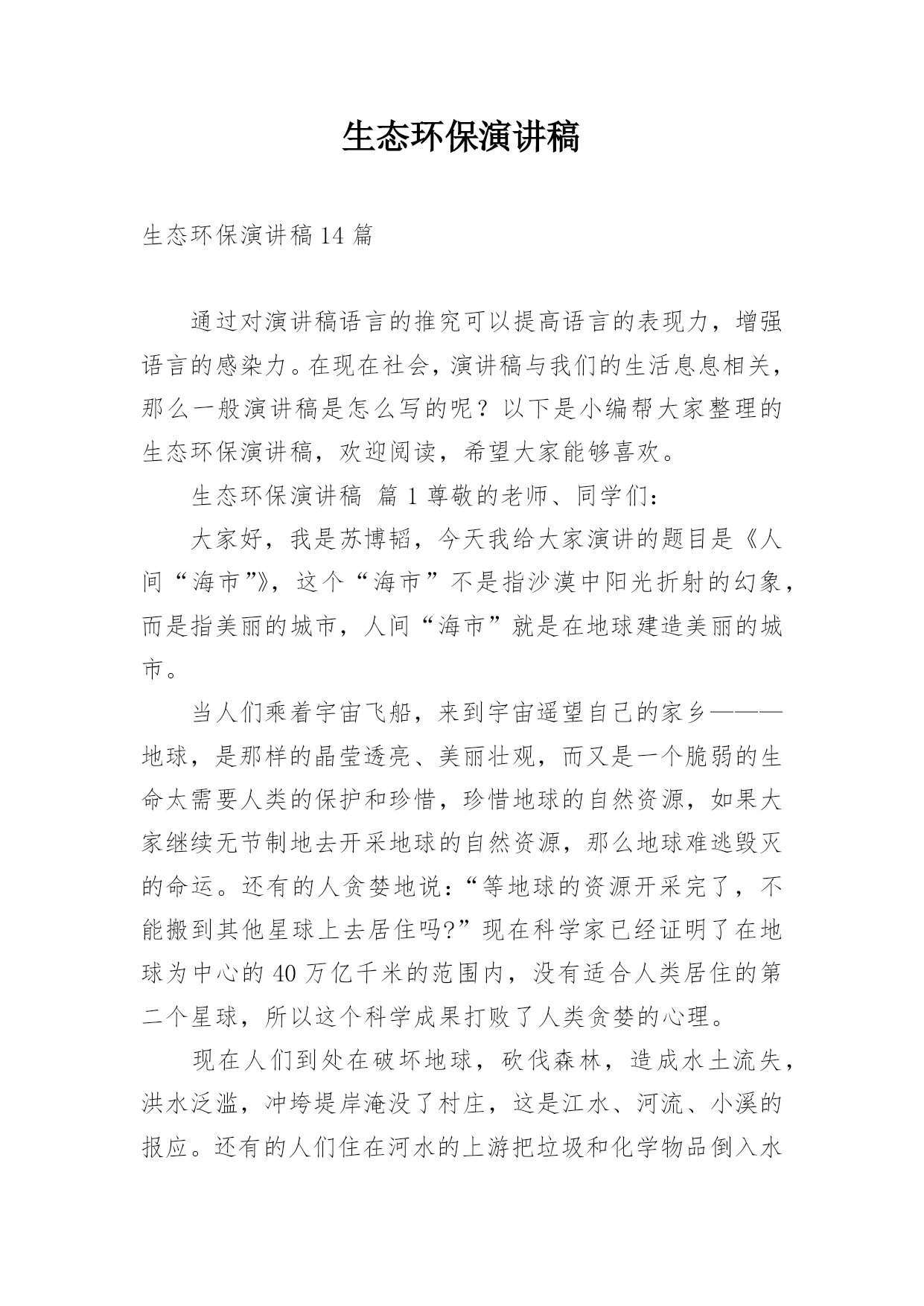 生态环保演讲稿生态环保演讲稿14篇通过对演讲稿语言的推究可以提高语言的表现力,增强语言的感染力。在现在社会,演讲稿与我们的生活息息相关,那么一般演讲稿是怎么写的呢?以下是小编帮大家整理的生态环保演讲稿,欢迎阅读,希望大家能够喜欢。生态环保演讲稿篇1尊敬的老师、同学们:大家好,我是苏博韬,今天我给大家演讲的题目是《人间“海市”》,这个“海市”不是指沙漠中阳光折射的幻象,而是指美丽的城市,人间“海市”就是在地球建造美丽的城市。当人们乘着宇宙飞船,来到宇宙遥望自己的家乡———地球,是那样的晶莹透亮、美丽壮观,而