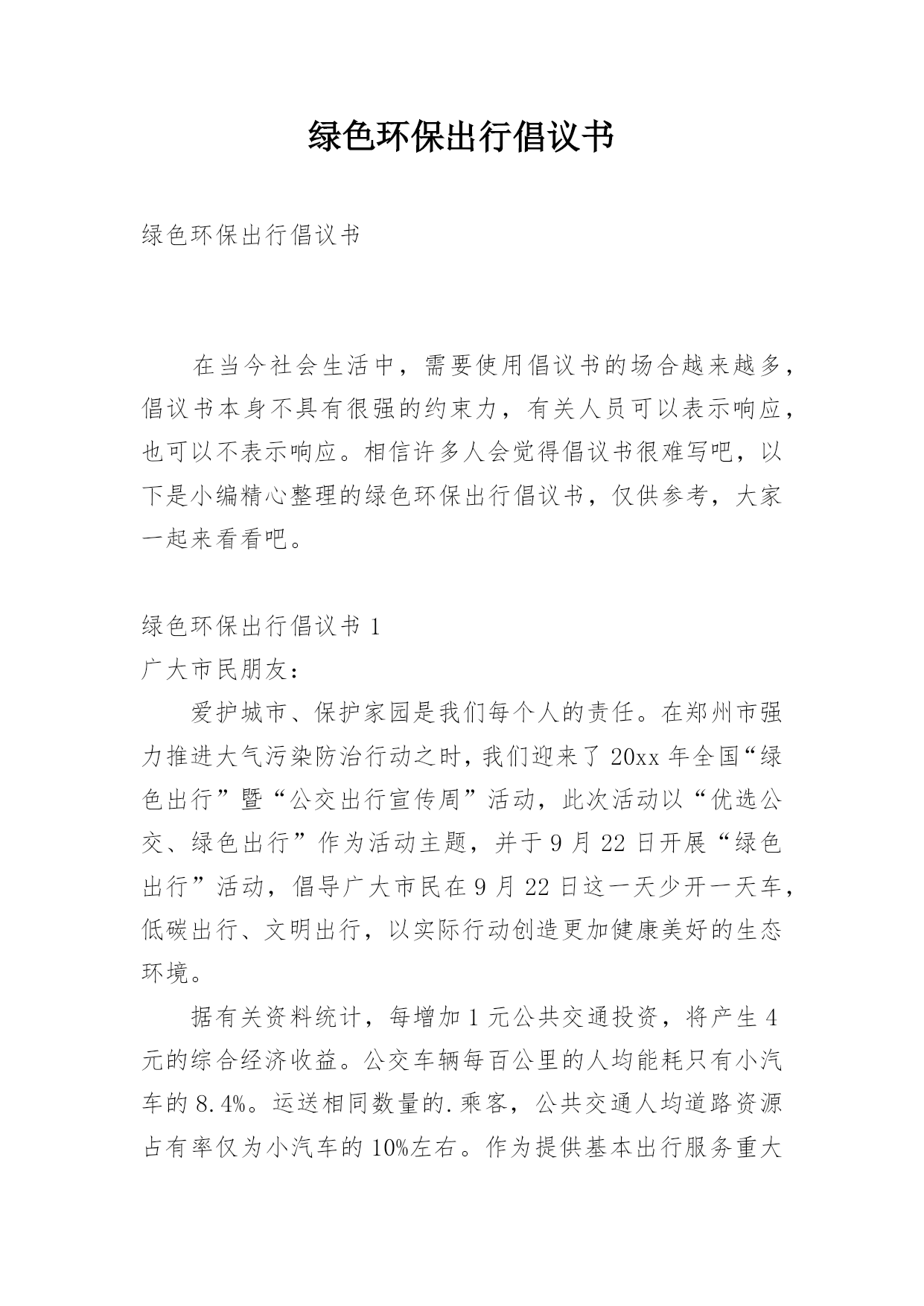 绿色环保出行倡议书绿色环保出行倡议书在当今社会生活中,需要使用倡议书的场合越来越多,倡议书本身不具有很强的约束力,有关人员可以表示响应,也可以不表示响应。相信许多人会觉得倡议书很难写吧,以下是小编精心整理的绿色环保出行倡议书,仅供参考,大家一起来看看吧。绿色环保出行倡议书1广大市民朋友:爱护城市、保护家园是我们每个人的责任。在郑州市强力推进大气污染防治行动之时,我们迎来了20xx年全国“绿色出行”暨“公交出行宣传周”活动,此次活动以“优选公交、绿色出行”作为活动主题,并于9月22日开展“绿色出行”活动,倡