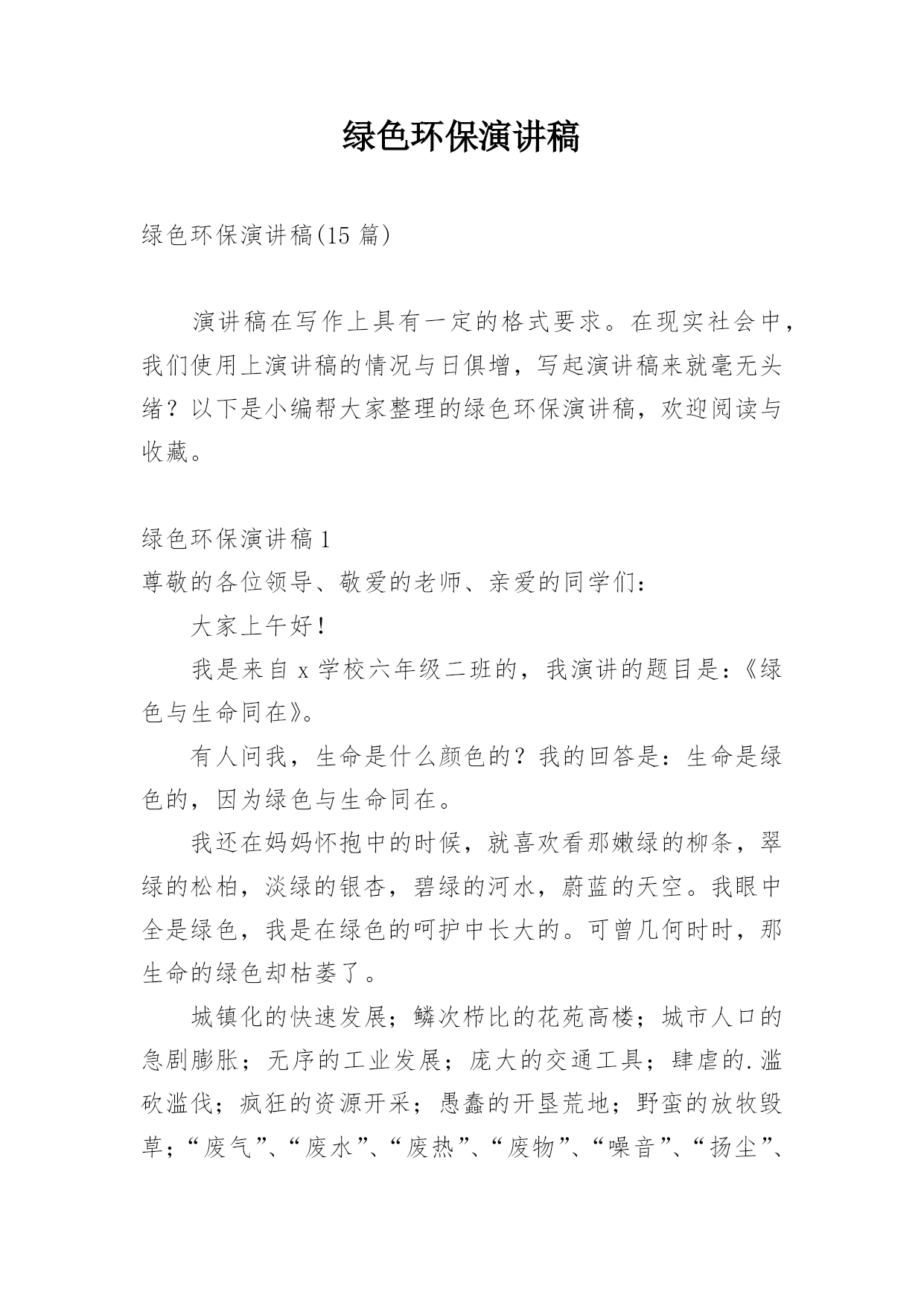 绿色环保演讲稿绿色环保演讲稿(15篇)演讲稿在写作上具有一定的格式要求。在现实社会中,我们使用上演讲稿的情况与日俱增,写起演讲稿来就毫无头绪?以下是小编帮大家整理的绿色环保演讲稿,欢迎阅读与收藏。绿色环保演讲稿1尊敬的各位领导、敬爱的老师、亲爱的同学们:大家上午好!我是来自x学校六年级二班的,我演讲的题目是:《绿色与生命同在》。有人问我,生命是什么颜色的?我的回答是:生命是绿色的,因为绿色与生命同在。我还在妈妈怀抱中的时候,就喜欢看那嫩绿的柳条,翠绿的松柏,淡绿的银杏,碧绿的河水,蔚蓝的天空。我眼中全是绿