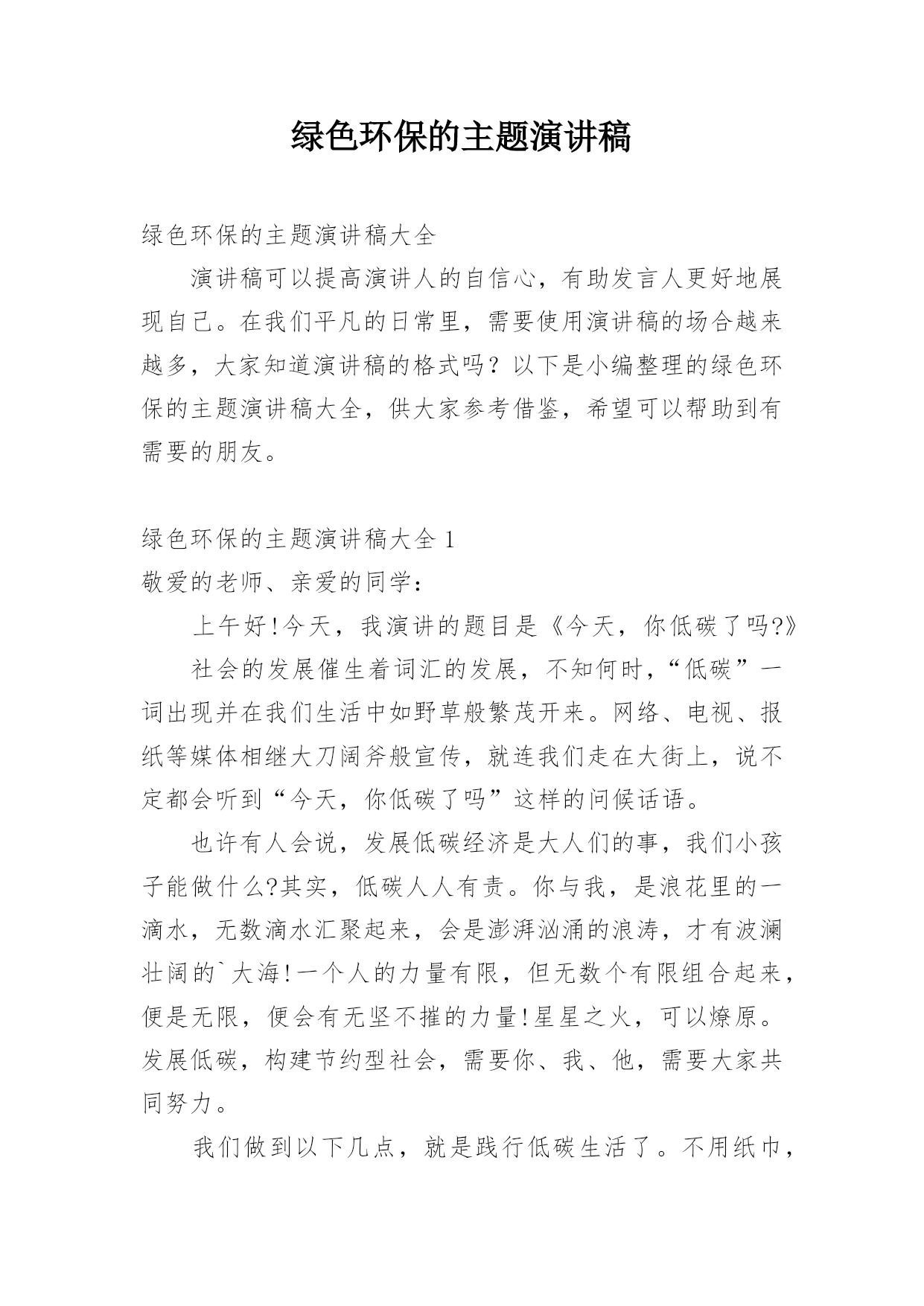 绿色环保的主题演讲稿绿色环保的主题演讲稿大全演讲稿可以提高演讲人的自信心,有助发言人更好地展现自己。在我们平凡的日常里,需要使用演讲稿的场合越来越多,大家知道演讲稿的格式吗?以下是小编整理的绿色环保的主题演讲稿大全,供大家参考借鉴,希望可以帮助到有需要的朋友。绿色环保的主题演讲稿大全1敬爱的老师、亲爱的同学:上午好!今天,我演讲的题目是《今天,你低碳了吗?》社会的发展催生着词汇的发展,不知何时,“低碳”一词出现并在我们生活中如野草般繁茂开来。网络、电视、报纸等媒体相继大刀阔斧般宣传,就连我们走在大街上,说